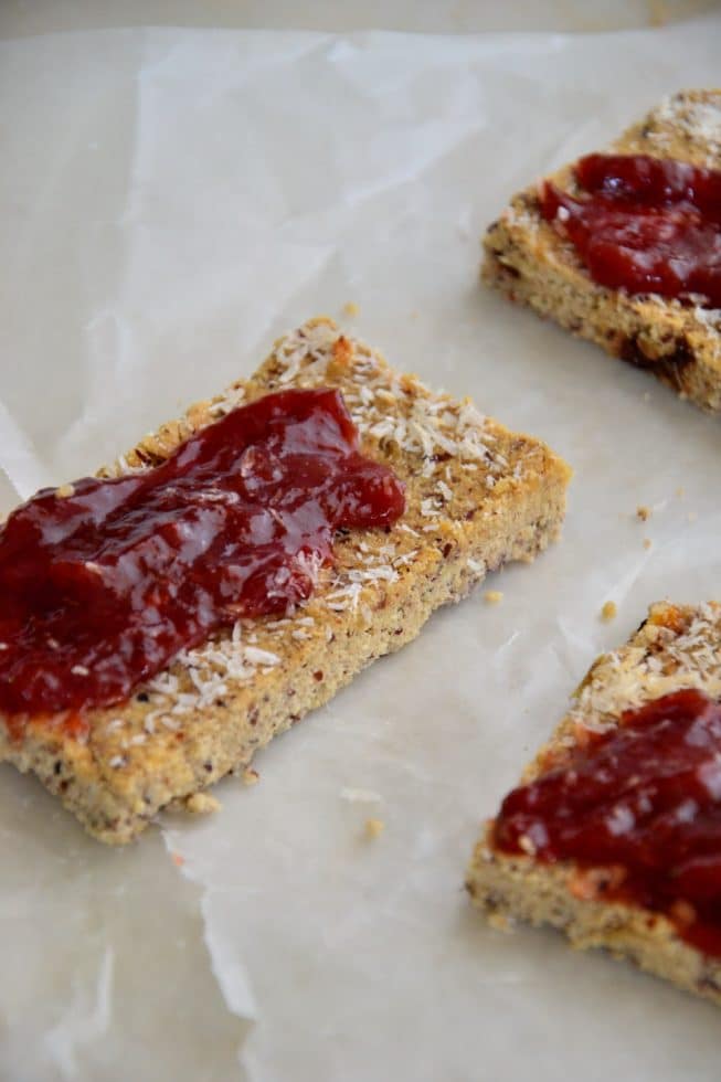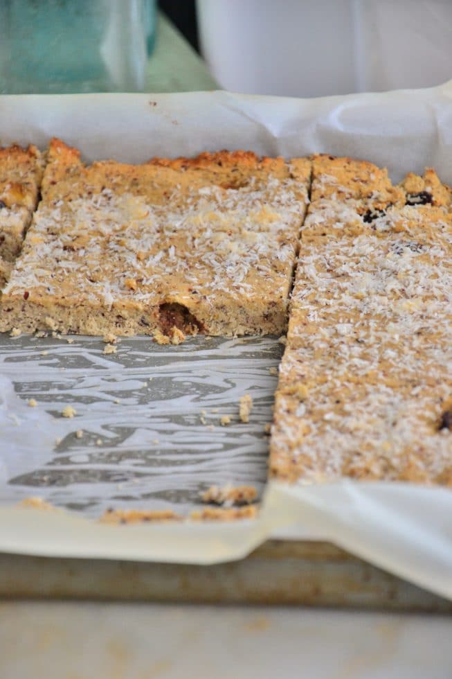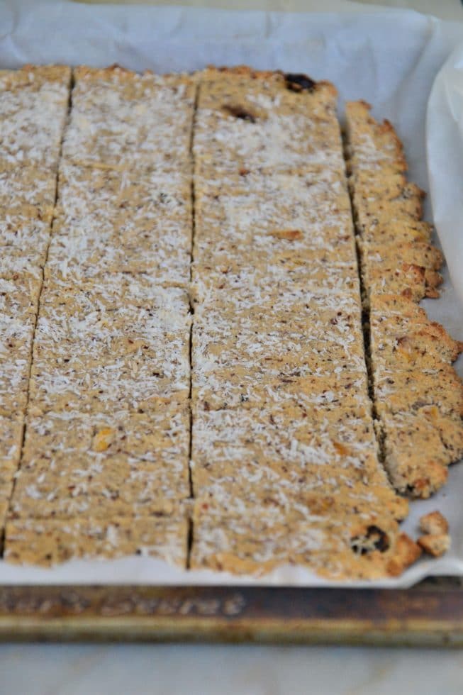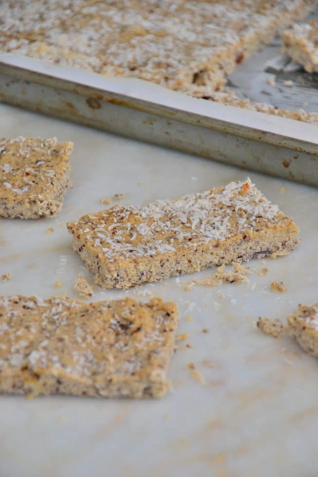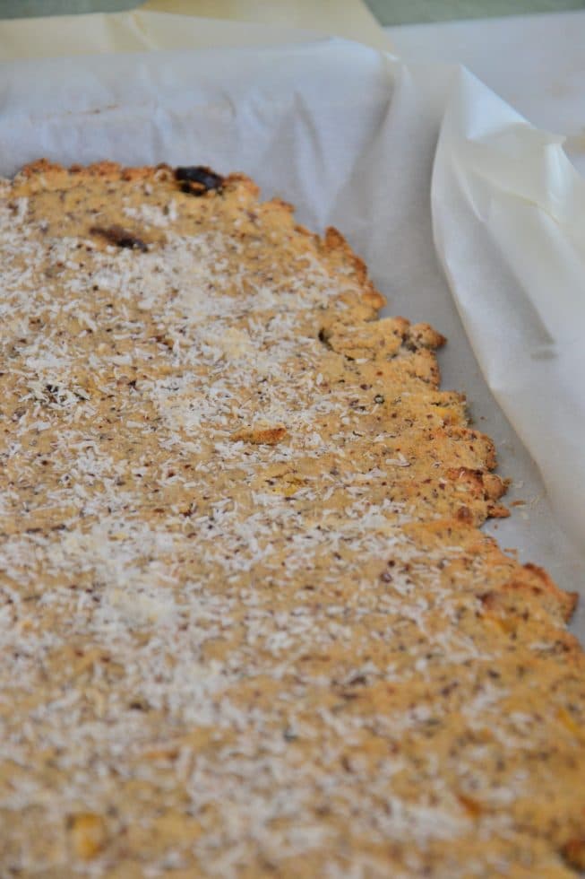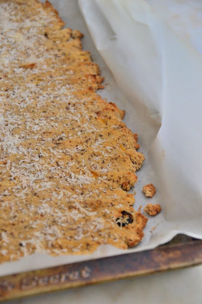 In a large bowl, combine all ingredients (except the coconut flakes) using your hands; mix well and use hands to form into a ball, then transfer the dough to a baking sheet lined with parchment paper. Use your hands to press down and form a ½ inch crust. Sprinkle the entire surface with the coconut flakes; use 1-2 Tbsp. depending on how large the surface of your dough is on the sheet. Bake for 55-60 minutes or until golden brown and soft but not mushy, rotating the baking sheet half way through baking, or until the crackers are golden brown.