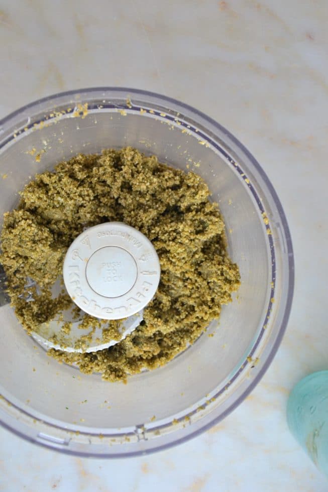 Place all the ingredients in a food processor, except the water. Process for 30 seconds. Then with processor running add the 2 tablespoons of water and continue to process in the food processor until a rough dough forms.