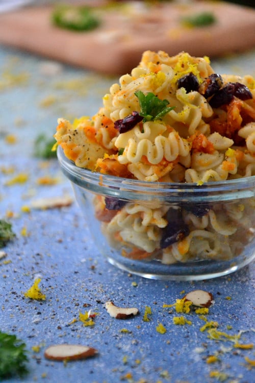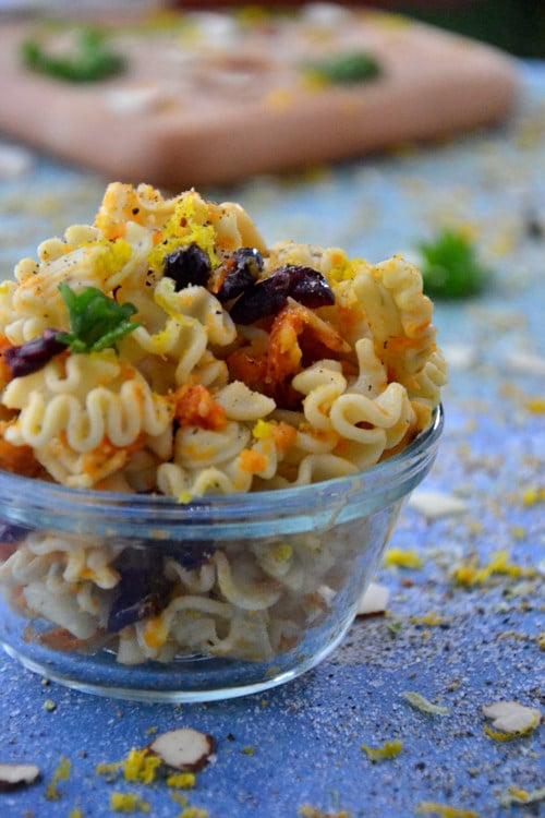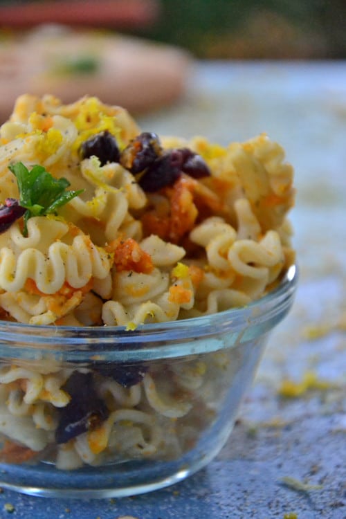 Last week I bought a carton of So Delicious Almond Milk for my clients who are allergic to dairy and there was a mere 1/2 cup left yesterday so I whipped up this sweet pasta recipe with the last few drops.