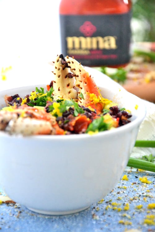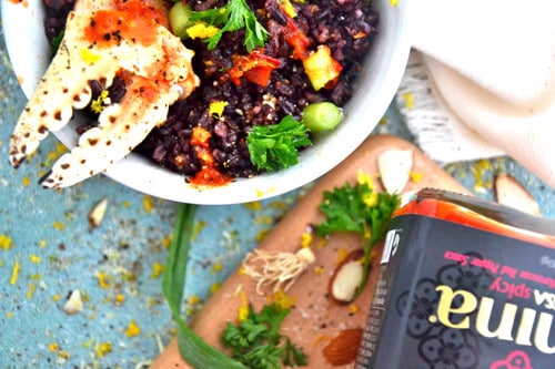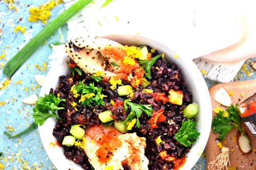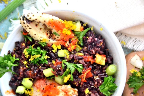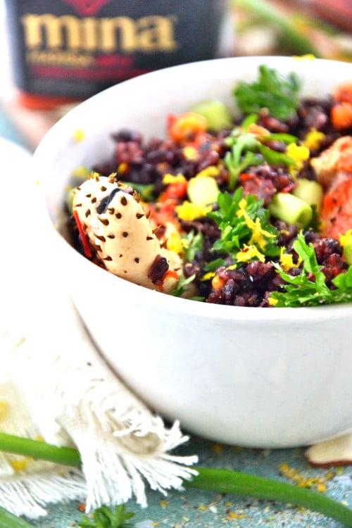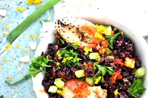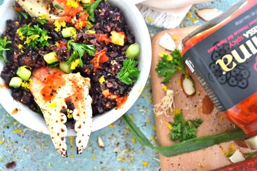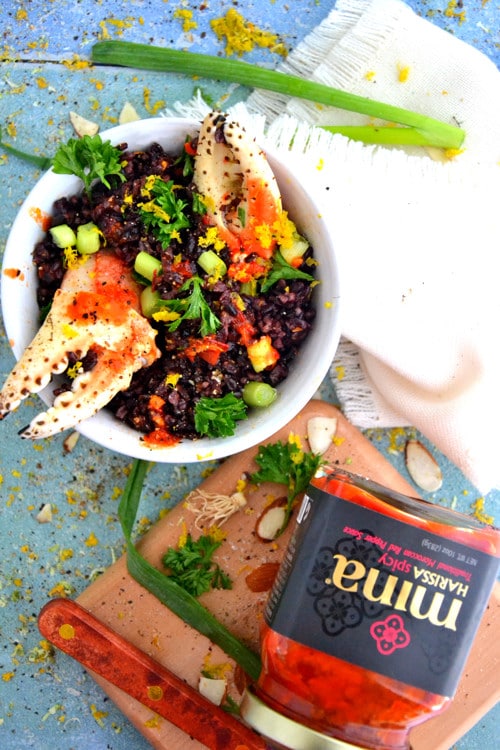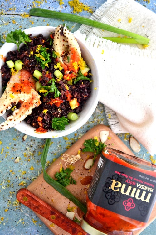 I topped my black rice with lemon zest, parsley, scallions and mina harissa sauce. Yes, I am obsessed with this stuff- it’s spicy but boy o’ boy does it taste good.