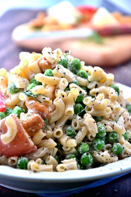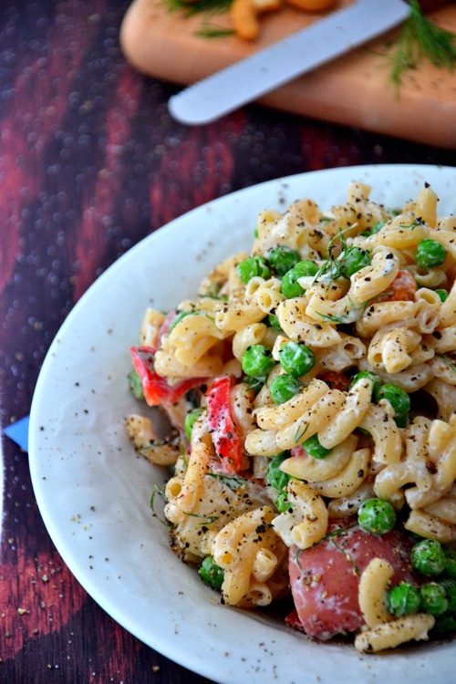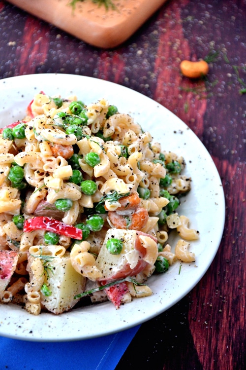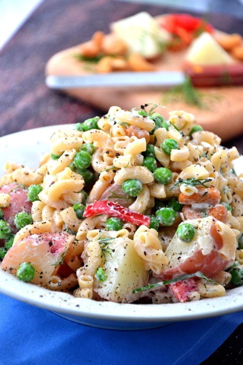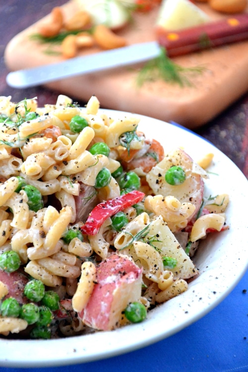 Must be the mixture of potatoes n’ pasta (BBQ staples) tossed with eye popping green peas, fresh red bell peppers. fresh dill and cashews.