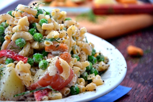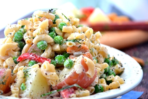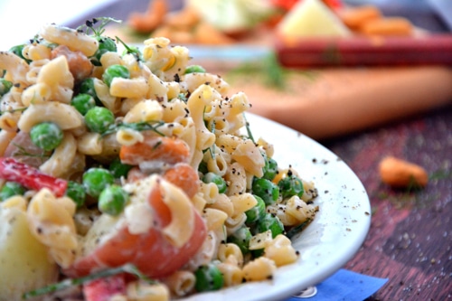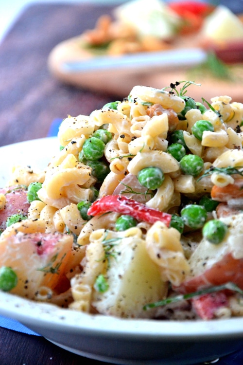 As you know there are a million and one variations of pasta salad on the internet, but I thought I’d switch this one up a bit with the potato addition.