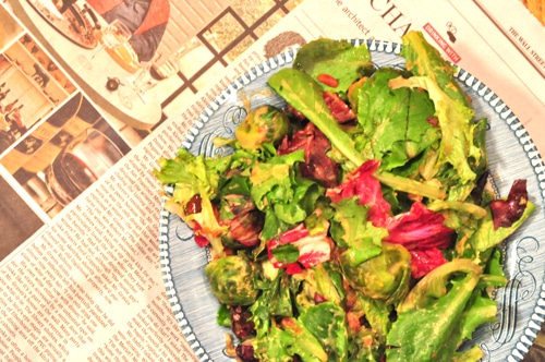 - Steam Brussels sprouts on the stove top over medium heat for 10 minutes or until tender and bright green. Remove from heat; transfer to a large salad bowl. Add mixed greens and arugula.