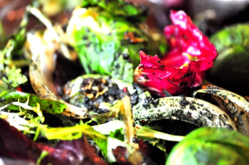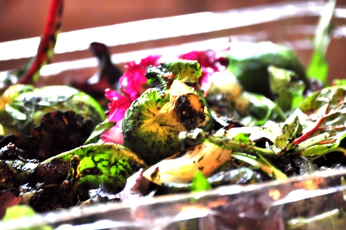 - Mound the mixed greens and arugula on a platter (or in this case open the sealed plastic container of mixed greens and arugula) and top with the dressed Brussels sprouts, mint leaves and pistachio nuts. Gently toss to coat. Garnish with lemon zest.