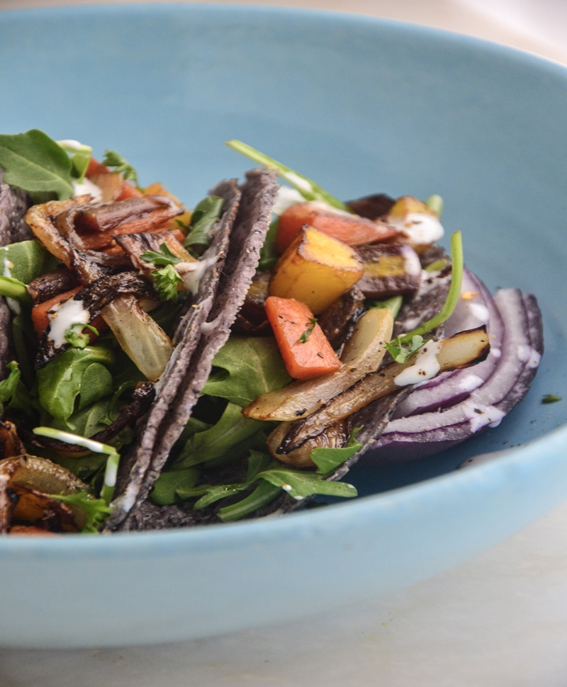 These vegetarian tacos are filled with roasted carrots, caramelized onions, and fresh arugula. A coconut milk yogurt sauce drizzled on top is the perfect touch.