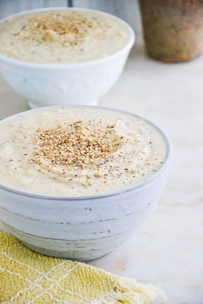 In a large food processor, combine the roasted cauliflower florets with the remaining ingredients and puree until smooth. Add more almond milk if you'd like a thinner consistency for your soup. Season to taste with seasame seeds, salt and pepper and serve.