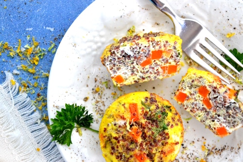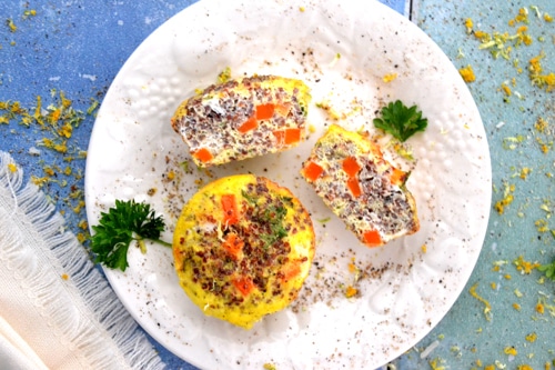 Prepare a muffin tin with nonstick baking spray. Pour egg mixture evenly into cups.