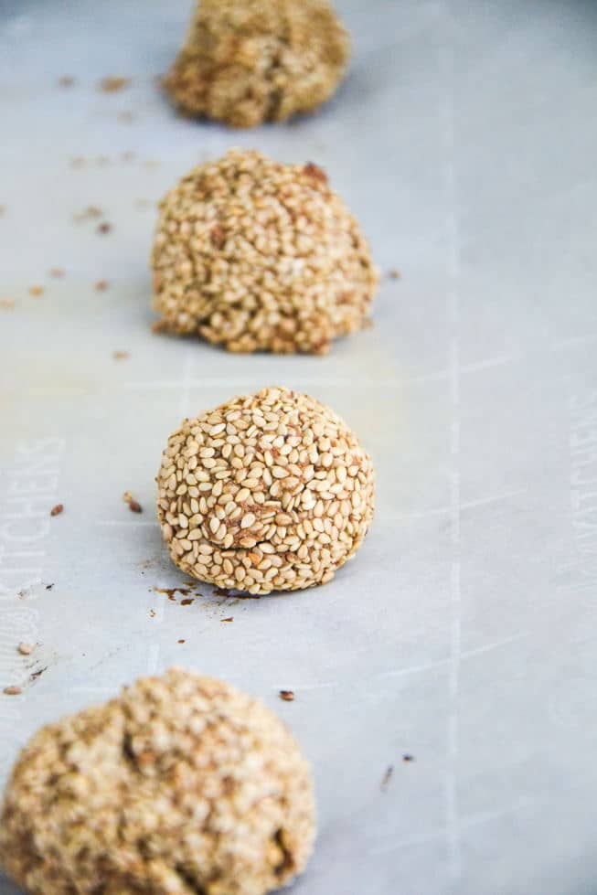 Place all of the falafel ingredients into a food processor and puree until well combined. Use a teaspoon make 1 inch size balls with your hands and roll the balls in the sesame seeds. Place on the prepared baking sheet and bake for 25 minutes or until golden brown. Meanwhile, make the Tahini Cherry Sauce, below.