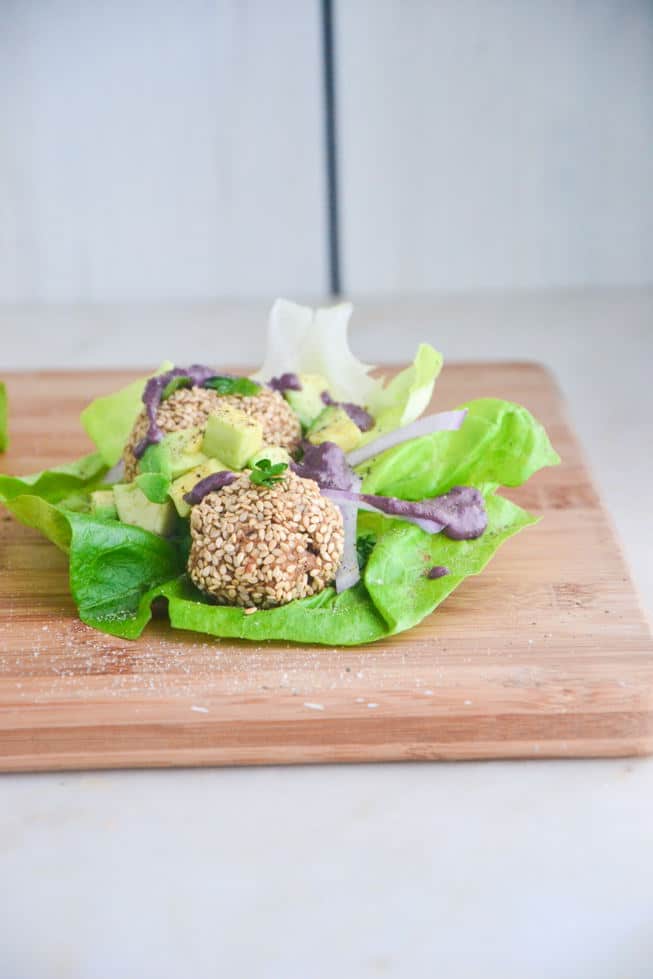 Remove the falafel from the oven and place into Bib lettuce leaves. Top with avocado, red onion and parsley. Drizzle the Tahini Cherry sauce on top, season to taste with sea salt and pepper and serve immediately.