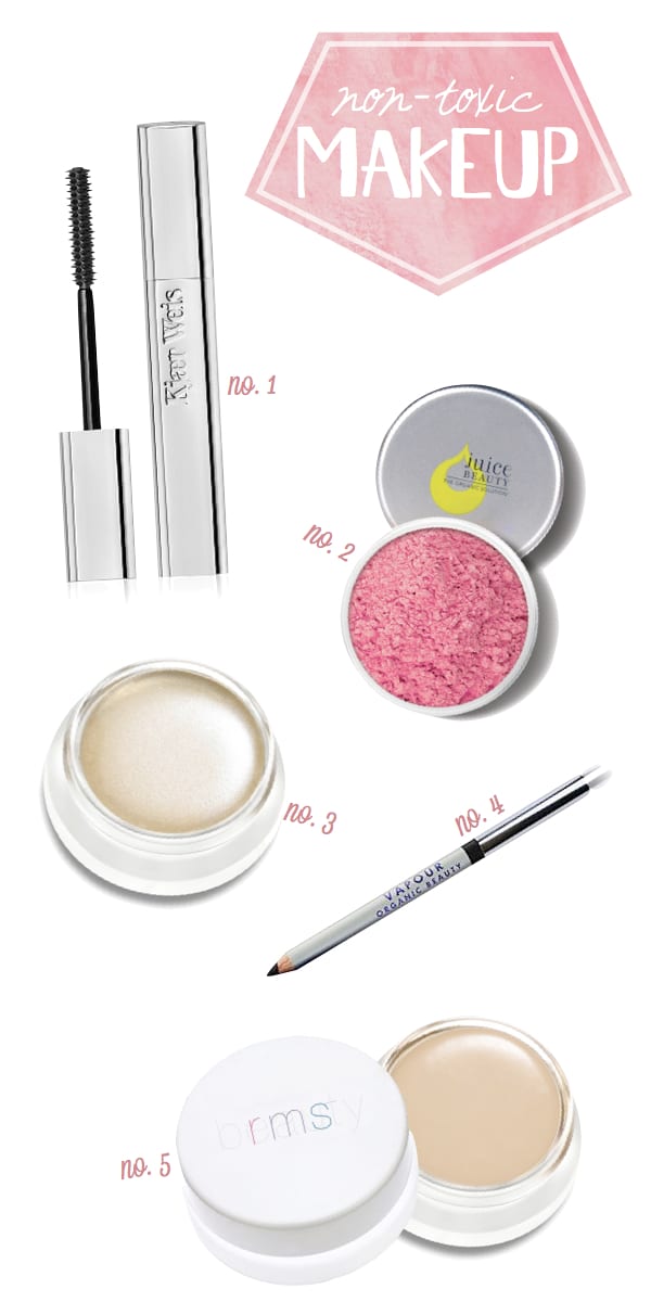 // 1. Kjaer Weis Mascara // 2. Juice Beauty Glowing Cheek Color // 3. RMS Beauty Living Luminizer // 4. Vapour Organic Beauty Mesmerize Eyeliner // 5. RMS Beauty “Un” Cover Up (Shade 22) //