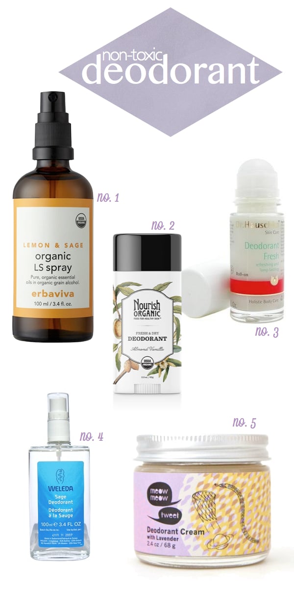 // 1. Erbaviva Organic Lemon and Sage Deodorant Spray // 2. Nourish Organic Almond Vanilla Deodorant // 3. // Dr. Hauschka Deodorant Fresh Roll-On // 4. // Weleda Sage Deodorant // 5. // Meow Meow Tweet Lavender Deodorant Cream //