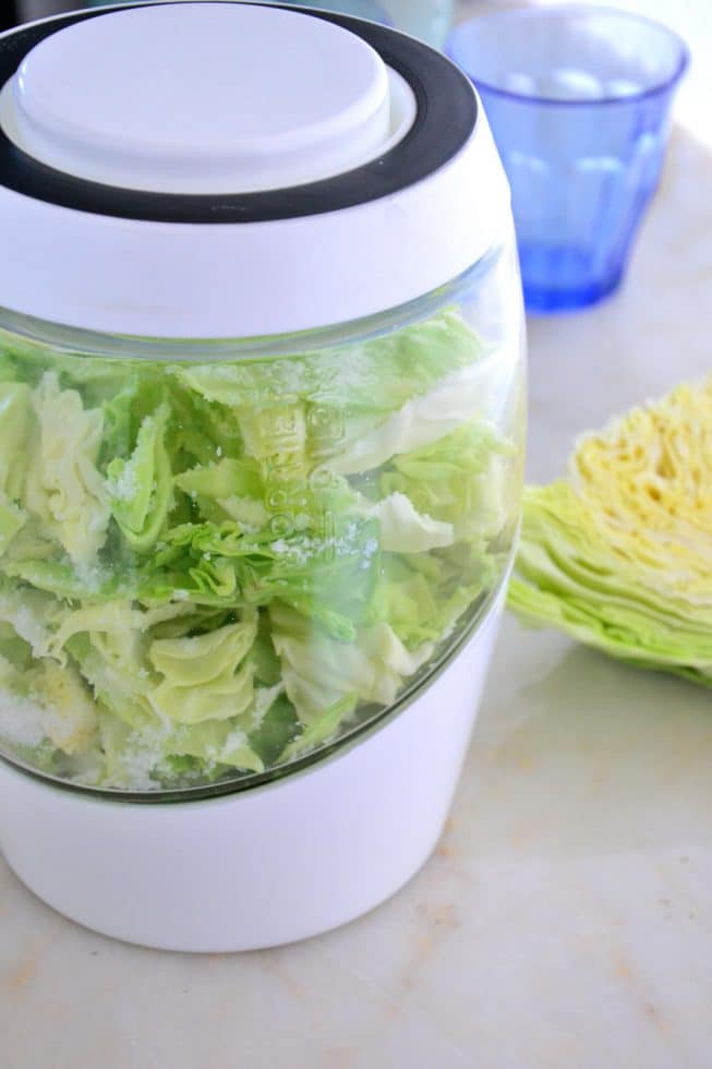 Well, it’s pretty simple. Grab a large sharp knife and slice your green cabbage in half and then into quarters. Then slice it very thin (or thick, depending on how you want your sauerkraut). I did a mix of thin and thick strips. Then you toss the cabbage into the glass container, add in sea salt and secure the top. That’s it! You let it sit for 1 week and you’ll start to notice the cabbage is fermenting and creating a bunch of good bacteria (good probiotics) for your gut.