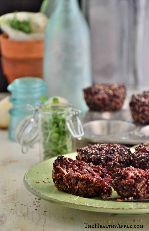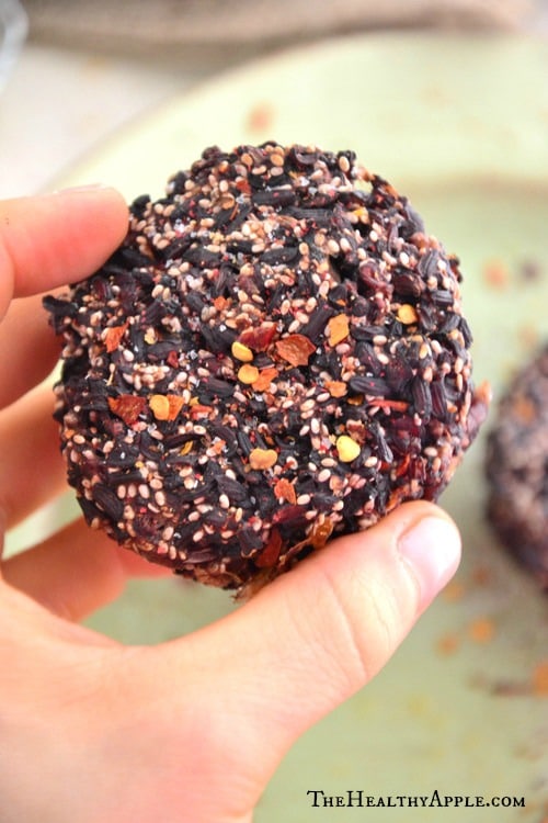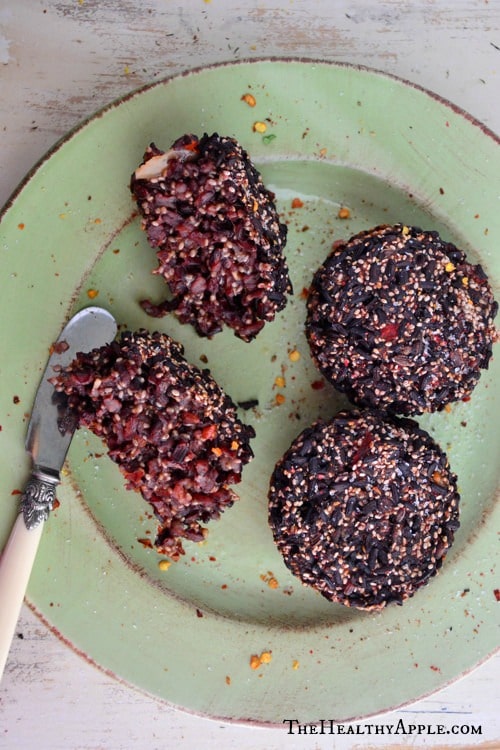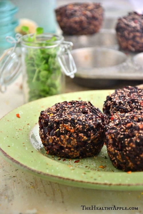 The other day I was thinking about how much you guys LOVED my Crispy Quinoa Bites and Mini Morning Egg Bites recipes… So I started developing other ideas for fun bite-sized easy vegetarian recipes – like these black rice bites – that you can pop into your mouth and enjoy for breakfast, lunch, dinner or a snack!