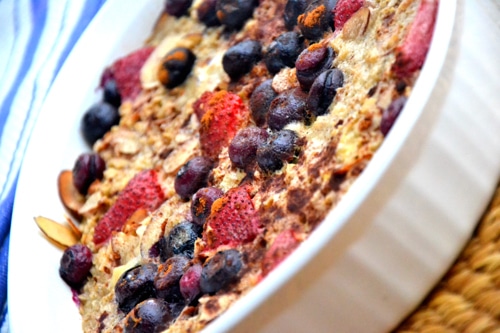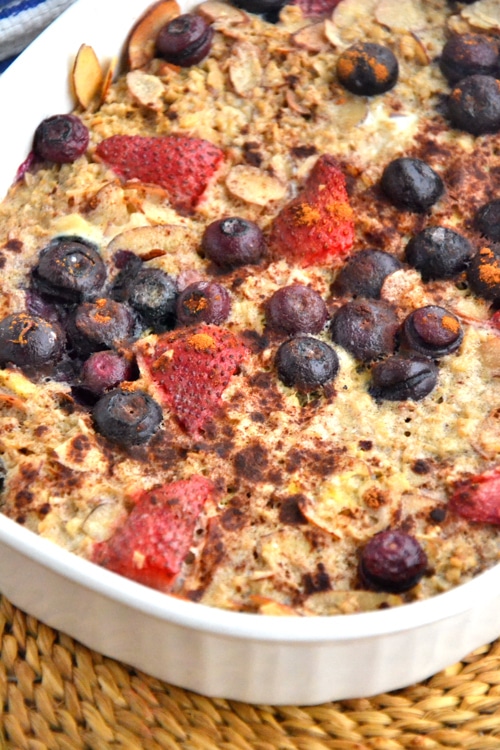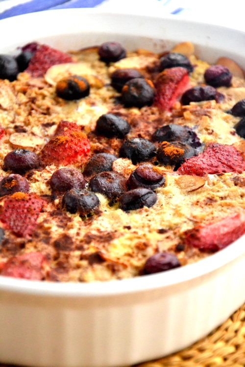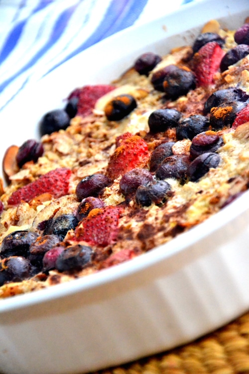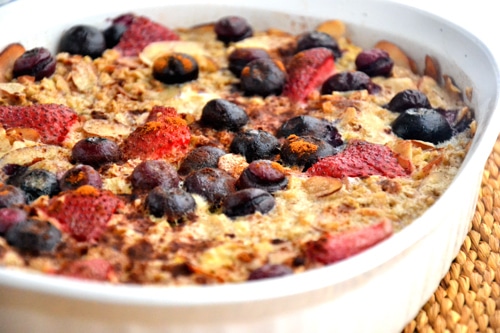 Transfer oat mixture to prepared baking dish; layer the almond milk mixture on top of oats. Scatter blueberries and strawberries on top.