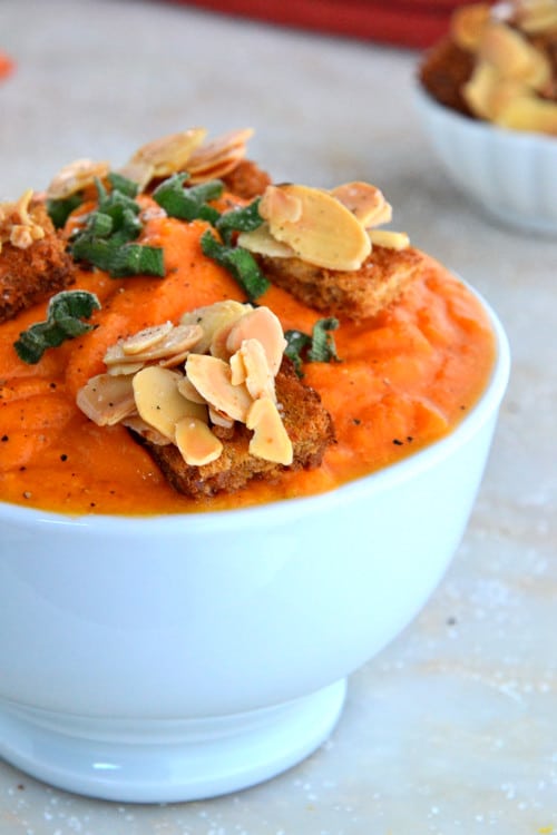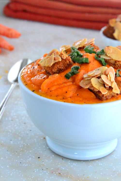 This looks delicious. I love carrot soup and usually use coconut milk. I will have to try this with the almond milk. And the crunchy almond croutons look to die for!