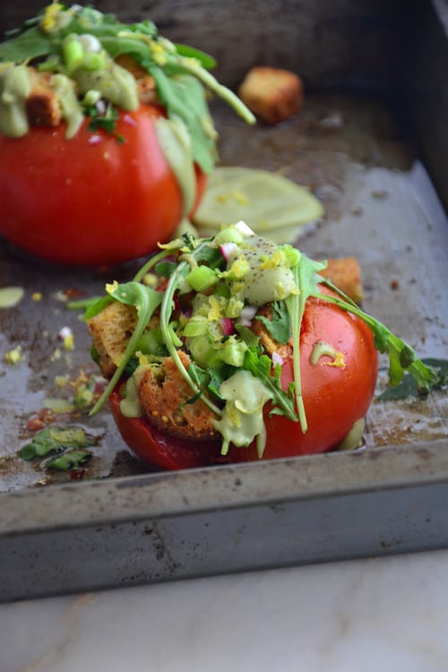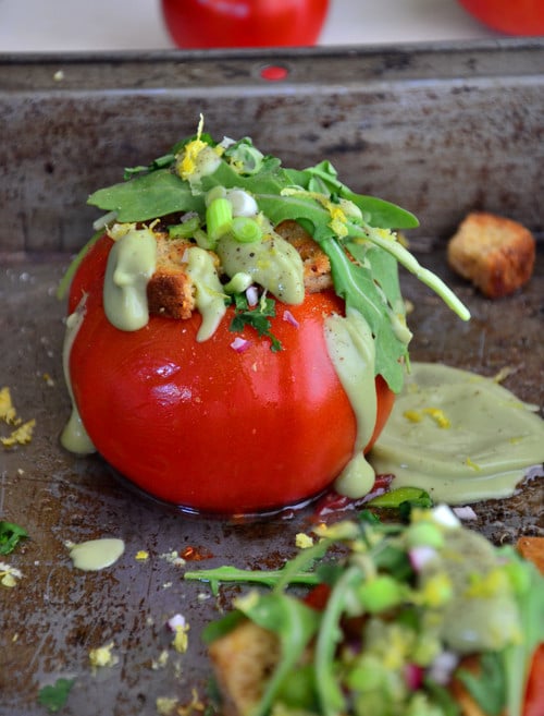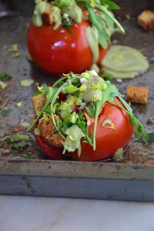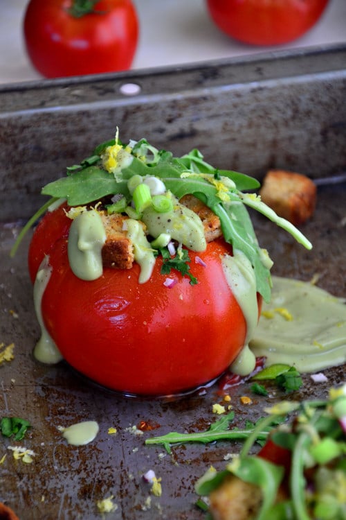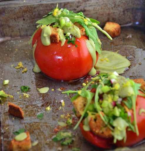 Remove the tomatoes from the oven and stuff with sauteed chickpeas, croutons, scallions, diced bell pepper, lemon zest, arugula, fresh herbs and drizzle of the avocado sauce. Garnish with sesame seeds. Drizzle with a splash of olive oil if needed. Serve immediately.