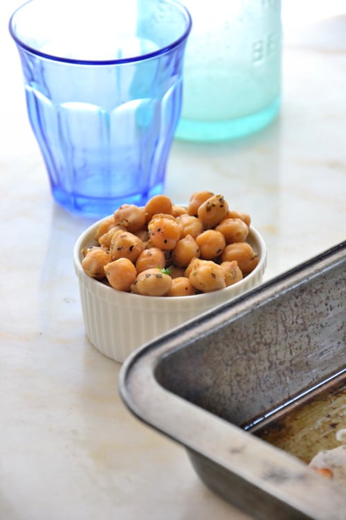 Sauté the chickpeas in a large skillet with 1-2 Tbsp. olive oil, salt, pepper, crushed red pepper flakes, garlic powder and dried oregano over high heat; shaking the pan for 5 minutes or until golden brown and toasted.
