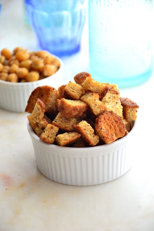 Using a sharp knife, cut 4 slices of bread into 15 tiny cubes and toss with 2 Tbsp. olive oil, salt and pepper; transfer to a rimmed baking sheet and bake for 12 minutes or until golden brown.