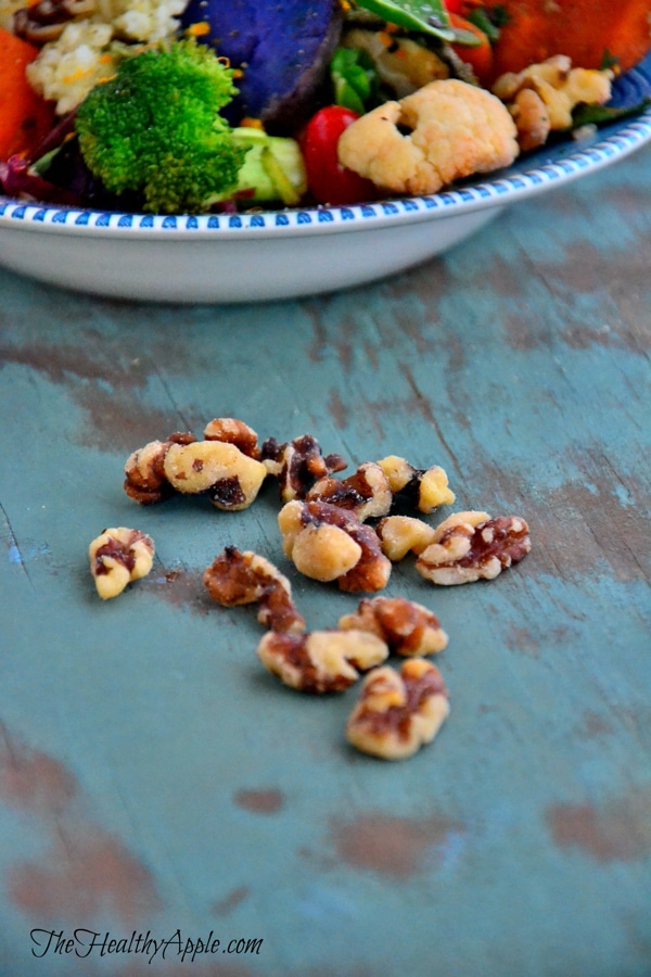 In a large bowl, combine cooked millet with roasted veggies, spinach, tomatoes, walnuts and pumpkin seeds.