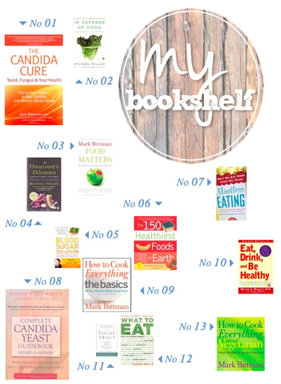 1. “The Candida Cure” // 2. “In Defense of Food” // 3. “Food Matters” // 4. “Omnivore’s Dilemma” // 5. “The Blood Sugar Solution Cook Book” // 6. “The 150 Healthiest Foods on Earth” // 7. “Mindless Eating” // 8. “Complete Candida Yeast Guidebook” // 9. “How to Cook Everything: The Basics” // 10. “Eat, Drink, and Be Healthy” // 11. “The Inside Tract” // 12. “What to Eat” // 13. “How to Cook Everything Vegetarian” // 14. “The Body Ecology Diet” // 15. “Wheat Belly Cookbook” // 16. “Food Politics” // 17. “Clean” // 18. “Trust Your Gut” // 19. “The Unhealthy Truth” // 20. “Clean Gut” // 21. “The Flavor Bible” // 22. “Cleanse Your Body, Clear Your Mind” // 23. “The Immune System Recovery Plan” // 24. “Wheat Belly” // 25. “How to Cook Everything”