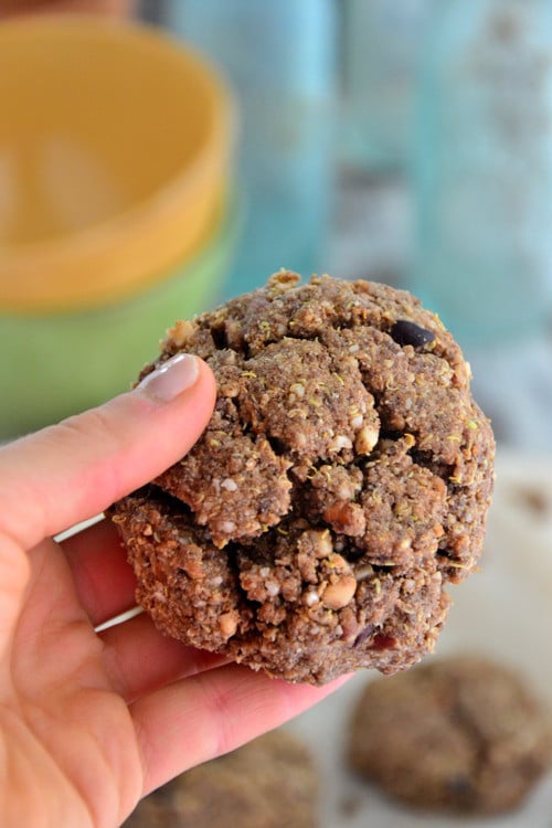did you put chocolate chips in yours? they are not listed in the ingredi ents but look like they are there in your pics. I made them and liked them but think I may try to add some cacoa nibs or chocolate chips next time – thanks for the great high protein, all natural recipe