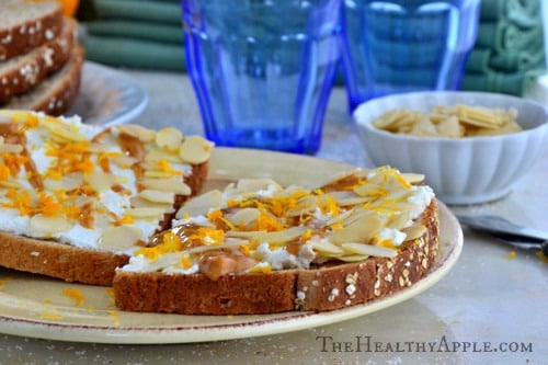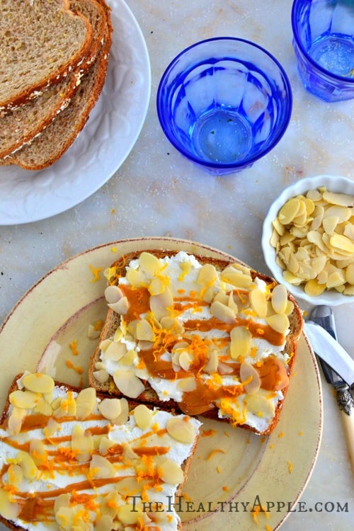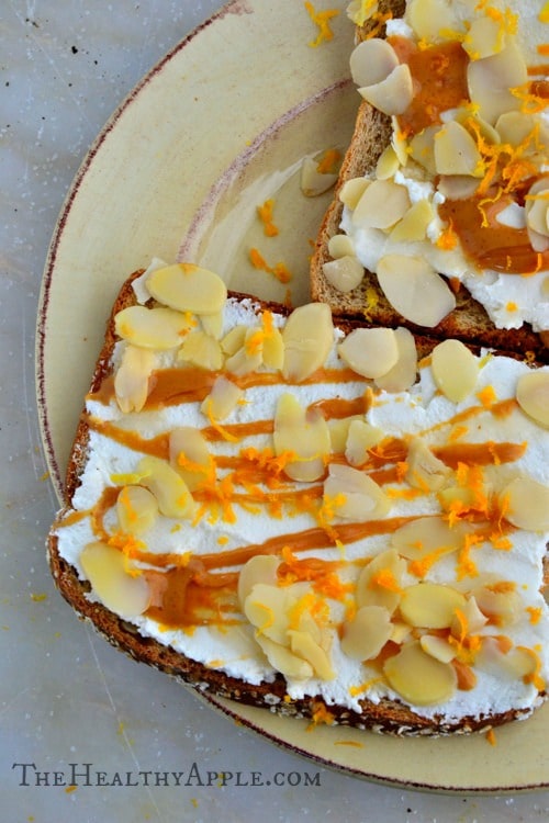 Almonds? Check. Toast? Check. Ricotta Cheese (or dairy-free cheese)? Check. Almond Butter? Check. Honey? Check? Orange Zest? You betcha.