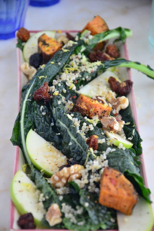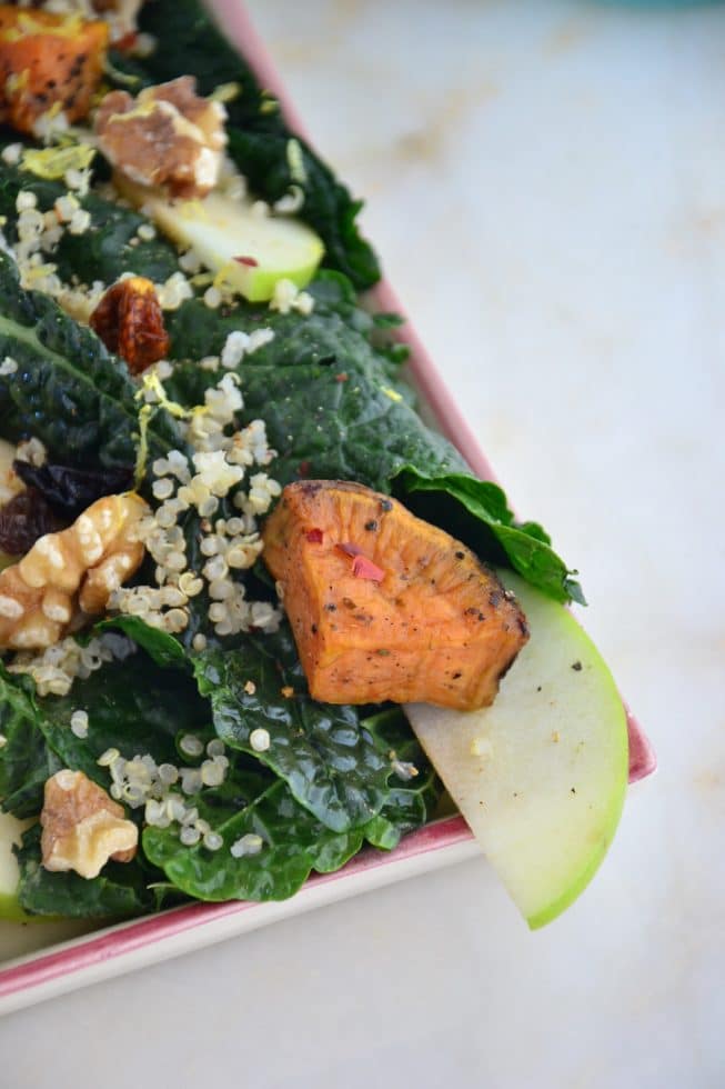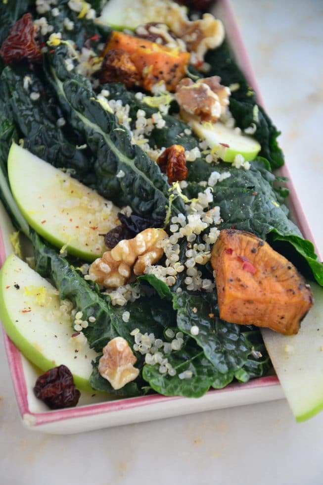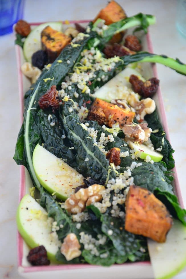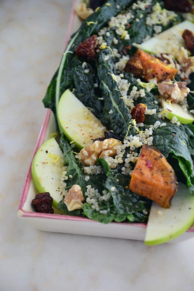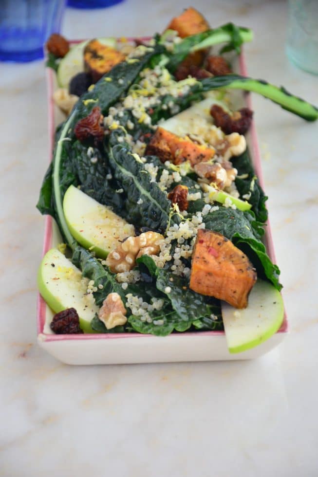 This is an easy recipe that you can serve on a weeknight. It’s also great to serve when entertaining on the weekends. If you can multi-task then you can do this recipe in a jiffy. All you need to do is roast the sweet potatoes while you’re cooking up the quinoa and massage the kale with a little bit of oil. Then you toss it all together with some fresh lemon juice and zest, dried fruit, green apples and walnuts. Simple, right?