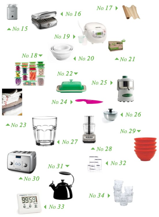 1. Square Baking/Pizza Stone // 2. Mixing Bowl Set // 3. Rectangular Bakers // 4. Mandolin Slicer // 5. Slow Cooker // 6. Pyrex Set // 7. Tea Bags // 8. Round French Oven // 9. Blender // 10. Towels // 11. Natural Cheesecloth // 12. Citrus Juicer // 13. Measuring Cup // 14. Garlic Crusher //15. Frozen Yogurt, Sorbet & Ice Cream Maker // 16. Waffle Maker // 17. Parchment Paper // 18. Storage Box Set // 19. Rice Cooker // 20. Silicon Prep Bowls // 21. Trash Bags // 22. Stoneware Butter Dish // 23. Dish Towels // 24. 8″ Chef’s Knife // 25. Juicer // 26. Salad Spinner // 27. Clear Glass // 28. Food Processor // 29. Silicone Pinch Bowls // 30. Toaster // 31. Tea Kettle // 32. POP Container Set // 33. Digital Timer // 34. Stackable Juice Glasses