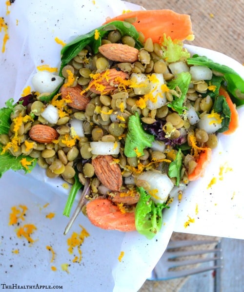 Cooking lentils is no new thing. For this dish, I simply cooked dry lentils and tossed them together with a few of my favorite veggies. Swiss chard, Vidalia onions and carrots to name a few but you can easily use spinach or kale if you can’t find Swiss chard in your food store or farmer’s market. The veggies I used are really more suggestions than anything else because you can mix n’ match what you want to add in. I have a deep love for Swiss chard and I think it makes any dish better. I also tossed in a bit of fresh orange juice n’ zest and almonds for a bit of flavor.