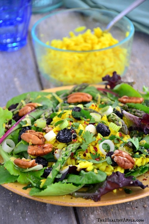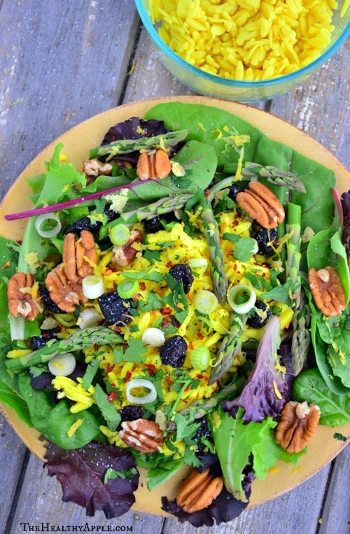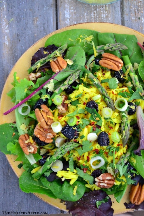 Simple rice is tossed with creamy hummus then jazzed up with pecans, dried cherries, asparagus, saffron, scallions, cilantro and pretty lettuce leaves. If you can believe it, this recipe can be whipped up in less than 5 minutes is you make the rice ahead of time (say, the night before).
