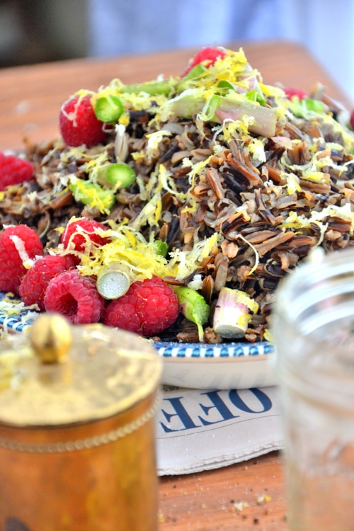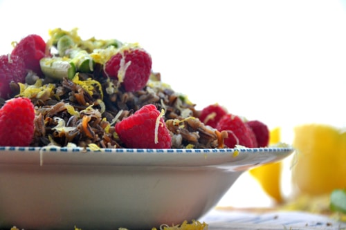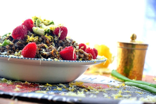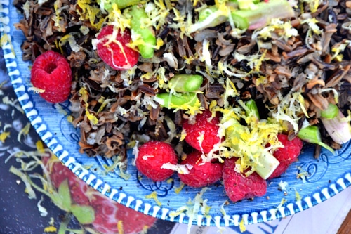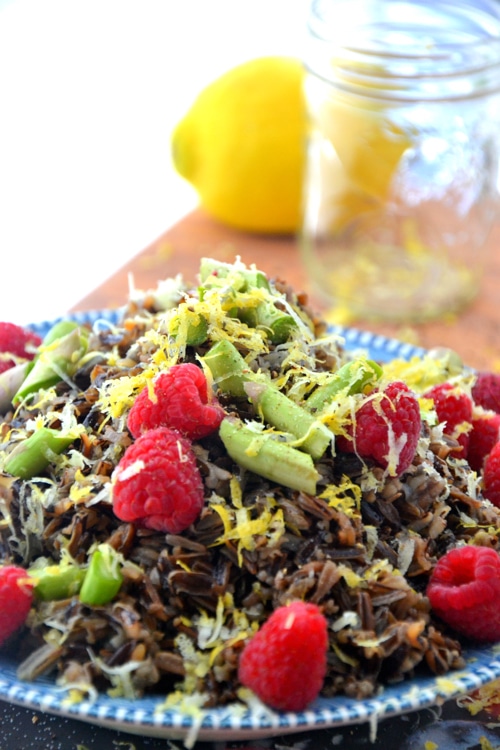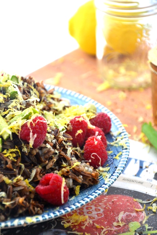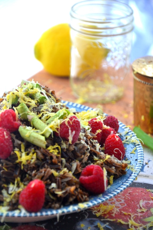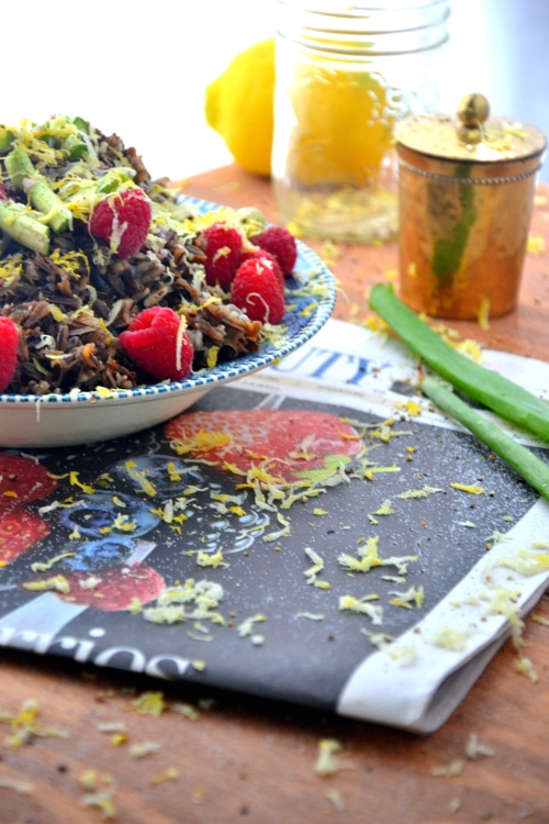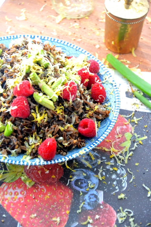 Rinse raspberries; set aside. Cut asparagus into 1/2 inch pieces. In a large bowl, combine cooked rice, asparagus, lemon zest, scallions, coconut, sea salt and pepper; gently toss to combine. Place in the refrigerator for 20 minutes.