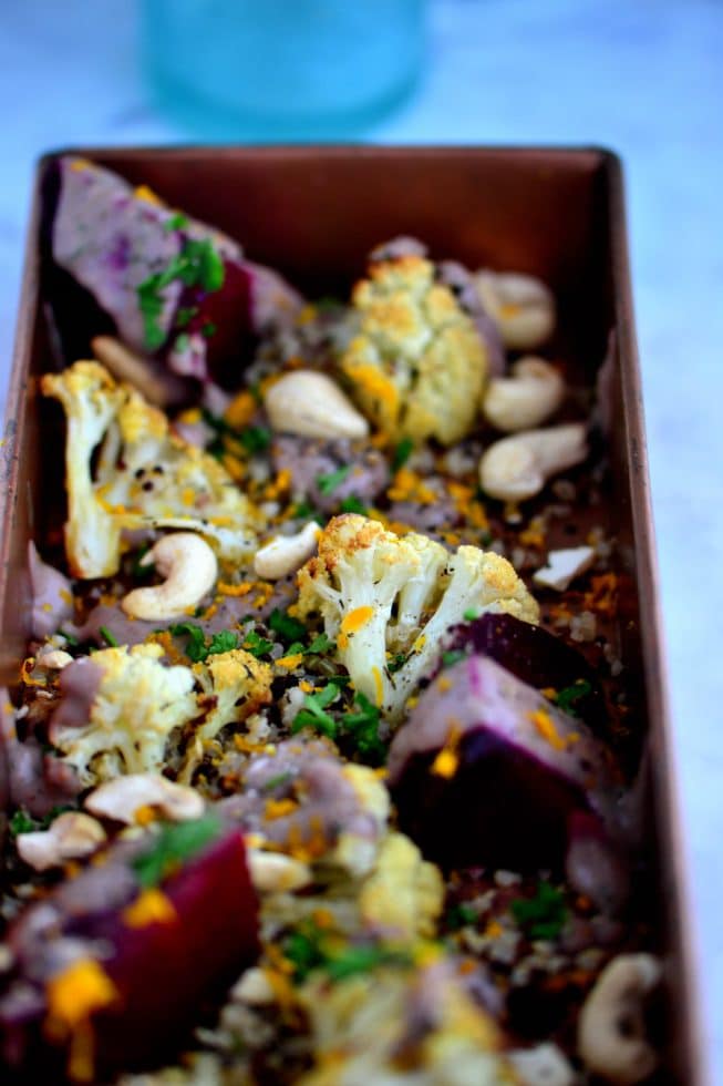 Remove the beets and cauliflower from the oven. Peel the beets and slice each beet into quarters.