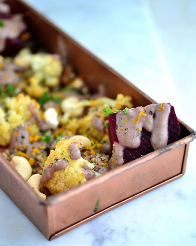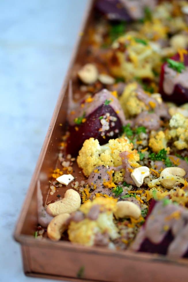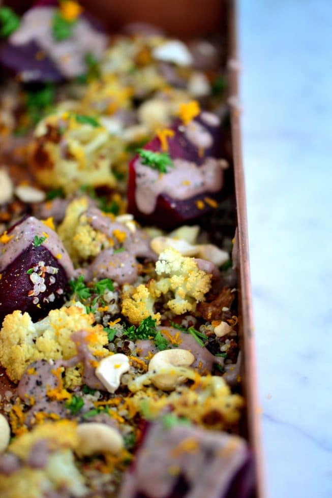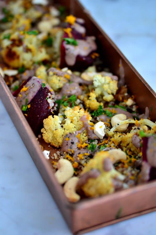 Combine the cooked quinoa, beets, cauliflower in a large bowl or on a large serving platter; add the white bean dressing and toss to combine. Garnish with the orange zest and parsley. Serve immediately. Season to taste with salt and pepper.