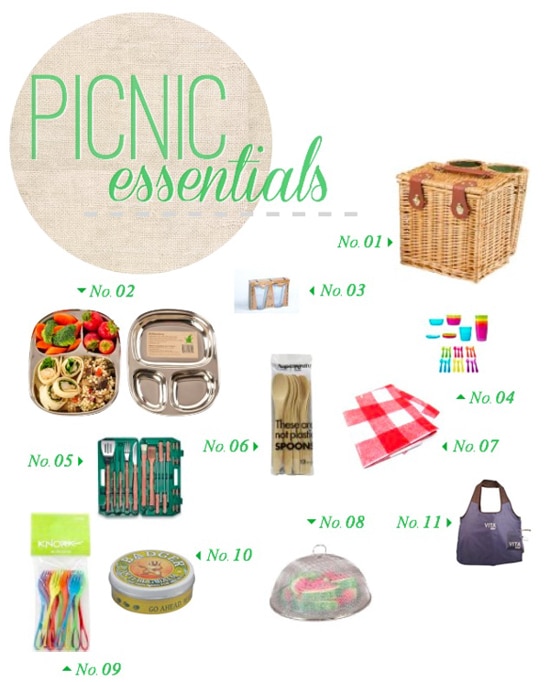 1. Picnic Basket // 2. Plastic-Free Picnic Set for 4 //3. To Go Cup // 4. Flatware, Bowl, Plate & Tumblr Set // 5. BBQ Set // 6. Wooden Cutlery Spoon // 7. Picnic Table Cloth // 8. Mesh Food Cover // 9. Outdoor Knorks // 10. Anti-Bug Balm // 11. Reusable Shopping Bag