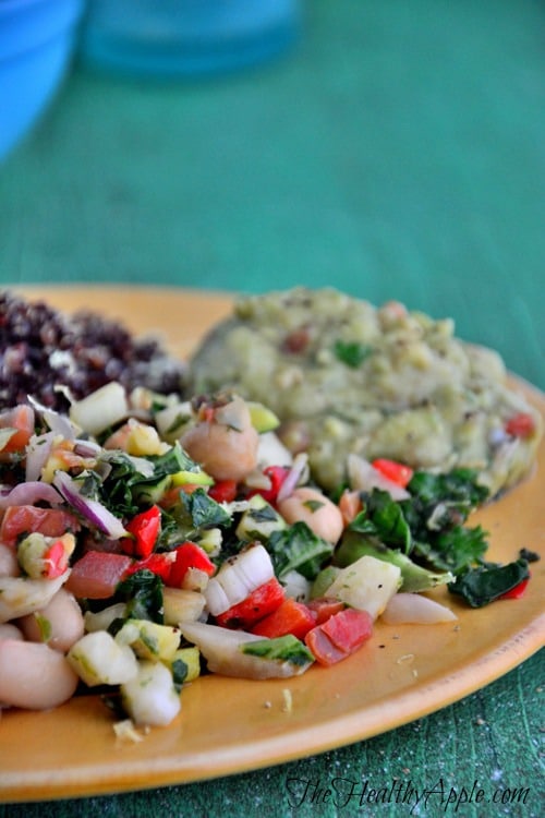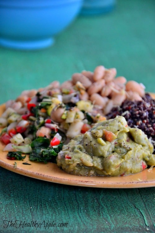 Portion serving plates with cooked quinoa, guacamole, white beans and chickpea mixture. Drizzle with balsamic vinegar to taste. Serve.