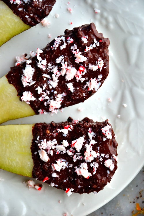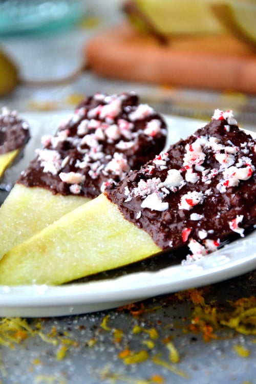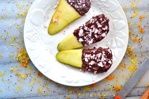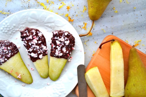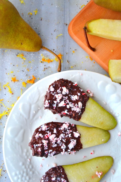 This pear recipe made a lovely lil’ snackie snack for me this week. Pears were on a mega-sale in my food store so I thought I’d buy a few and put my dark chocolate and candy canes to good use. Ya know?