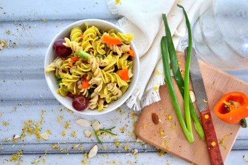 Mmmmmm, pasta lunch at my house with a cup of hot tea n’ chit chat. Sounds like a perfectly splendid afternoon to me; gluten-free pasta tossed in a coconut curry sauce complete with scallions, grapes and a bell pepper for a summer-like flair.