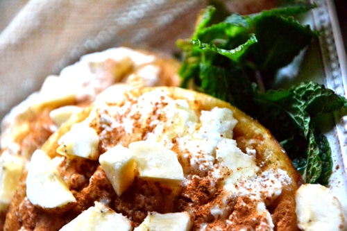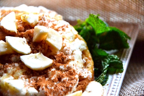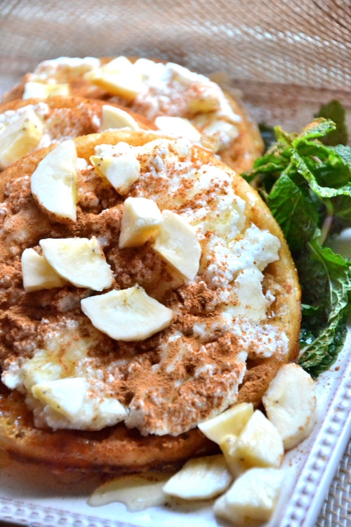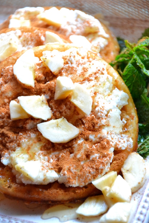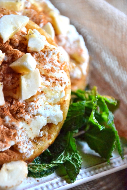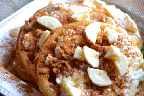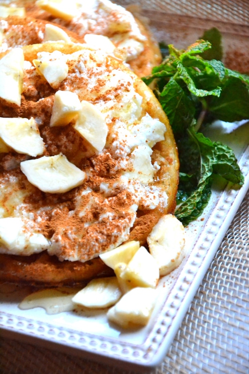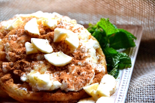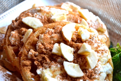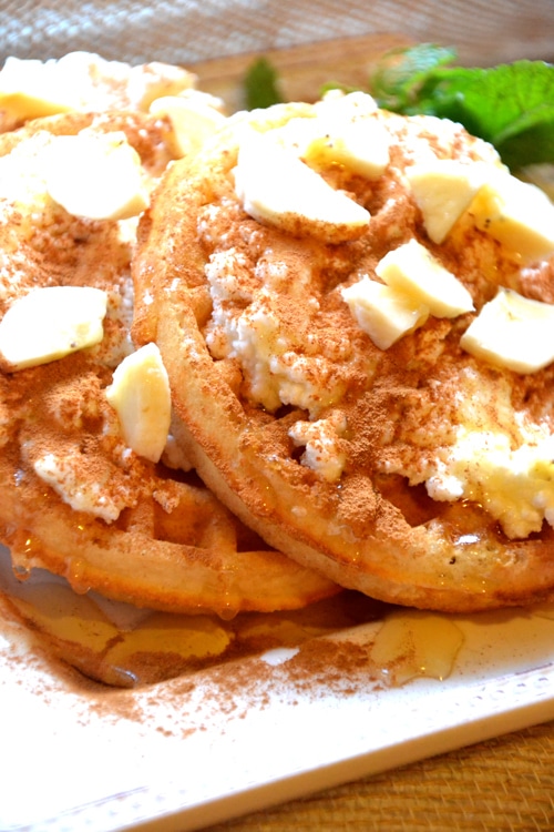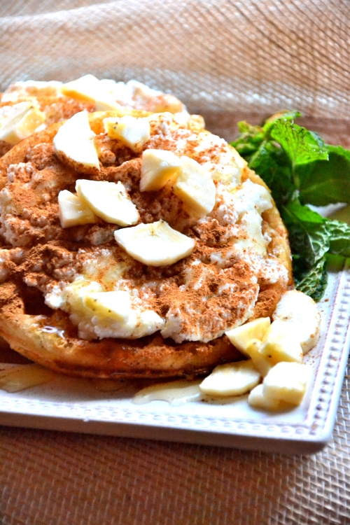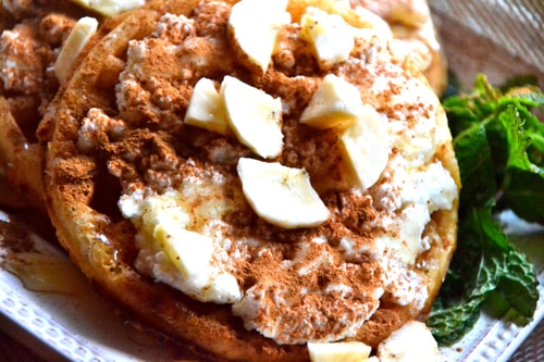 - Place waffle on a plate; top with almond butter, ricotta cheese, banana slices, a drizzle of honey and a sprinkle of cinnamon and fresh mint leaves.