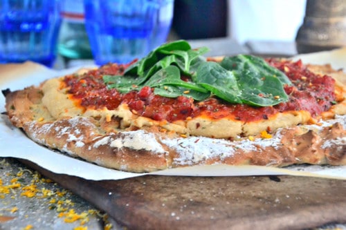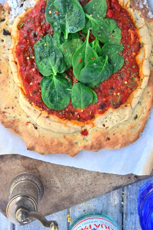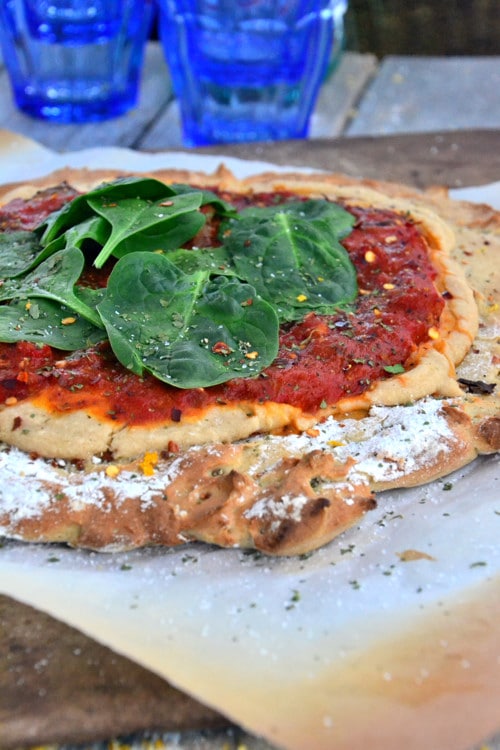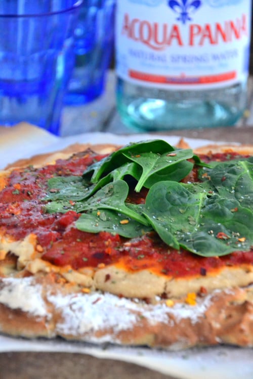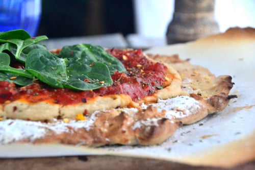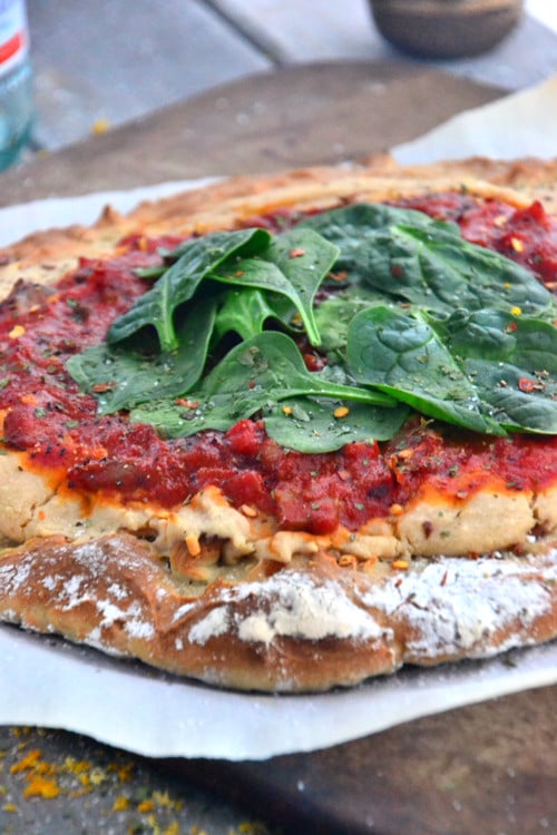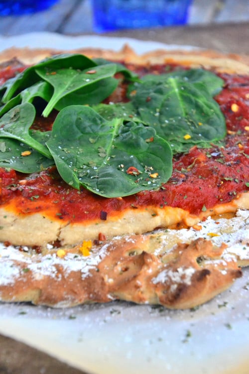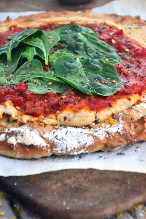 Bake dough for 10 minutes. Remove from oven, spread tomato sauce, olive oil and hummus on the pizza dough leaving 1/2 inch border on the ends. Sprinkle with nutritional yeast, fresh spinach, basil, oregano, sea salt and pepper.