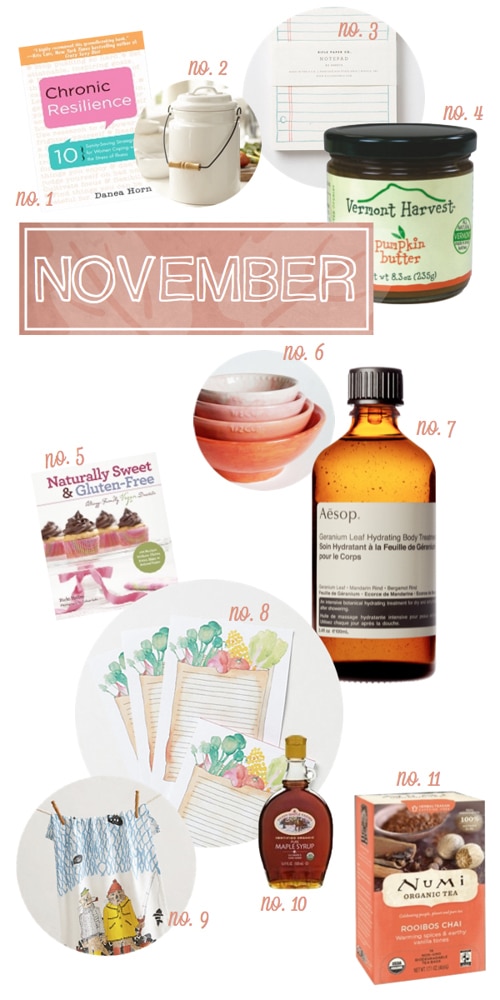 1. Chronic Resilience Book // 2. Compost Bin // 3. Notepad // 4. Pumpkin Butter // 5. Naturally Sweet & Gluten-Free Cookbook // 6. Ombre Measuring Cups // 7. Geranium Leaf Body Treatment // 8. Market Finds Writing Pad // 9. Dish Towel // 10. Organic Maple Syrup // 11. Numi Organic Rooibos Chai Tea