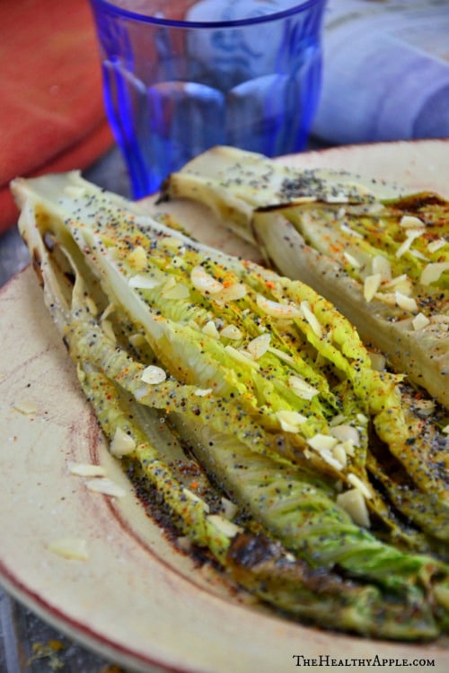 I’ve had grilled romaine before but never quite like this. It’s always served with olive oil and vinegar and well, that’s just boring to me so I tossed around a few ideas and peaked into my fridge for some fun dairy-free ingredients to coat these crisp heads of romaine.
