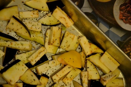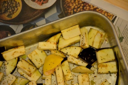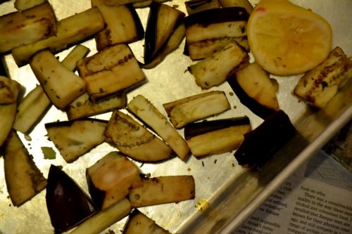 - Slice eggplant into 1/3 inch slices. Dip each eggplant slice into balsamic mixture to coat. Place eggplant slices onto a baking sheet or roasting pan. Toss lemon wedges on top.