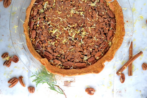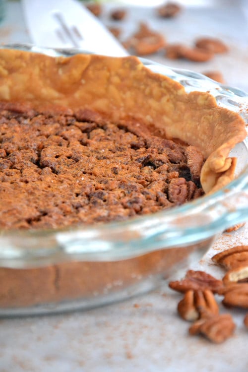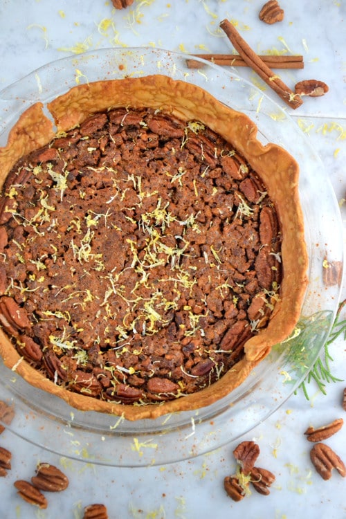 It’s a lot easier than I thought. And it looks so pretty. It’s one of those desserts you feel so good about making, isn’t it? I think that’s because we consider a pecan pie recipe being so labor intensive and difficult- so when it pops out of the oven and actually looks pretty darn good- it’s totally smile worthy.