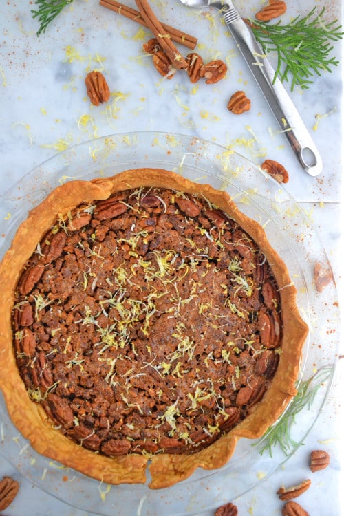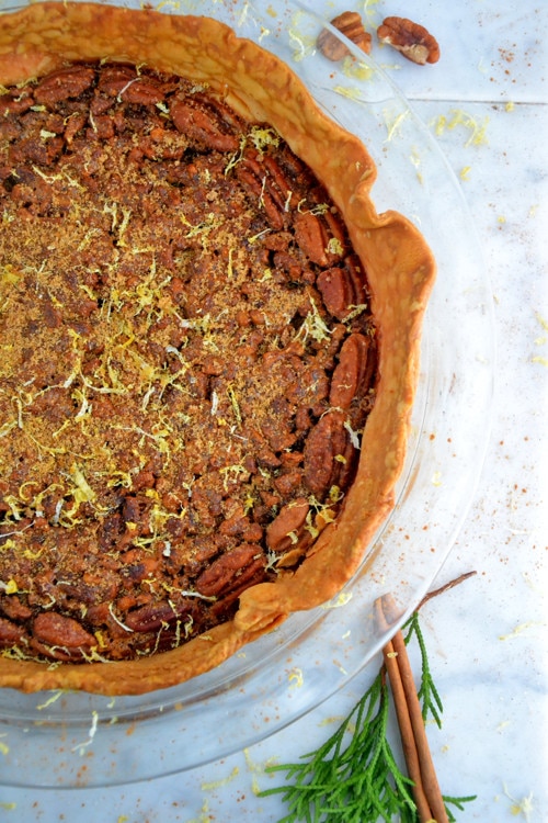 As I stood in my kitchen over the stove, baking away a million gingerbread people, I eyed a few pecan halves that I had hanging around my pantry. Usually, I would grind them up and use them as breadcrumbs for our holiday dishes but right then, the idea of a pecan pie, dense with pecans (of course) sounded absolutely fabulous.