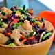 In a large bowl, combine roasted cauliflower, sweet potatoes, brown rice, beans, cabbage, snap peas, celery, spinach and carrots.