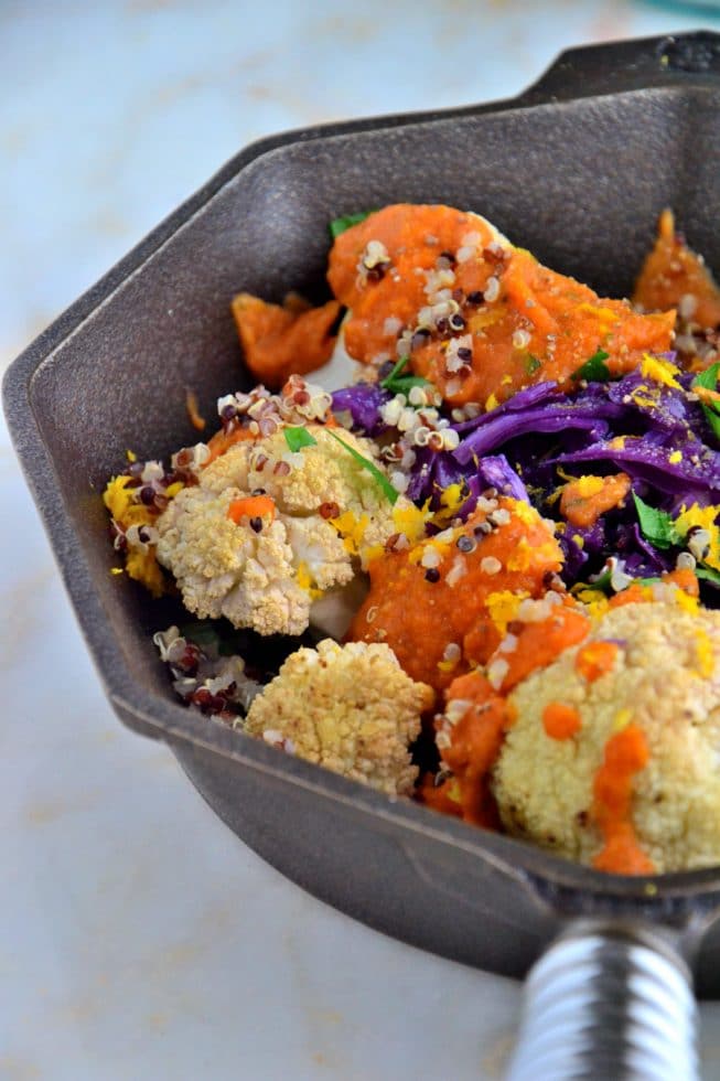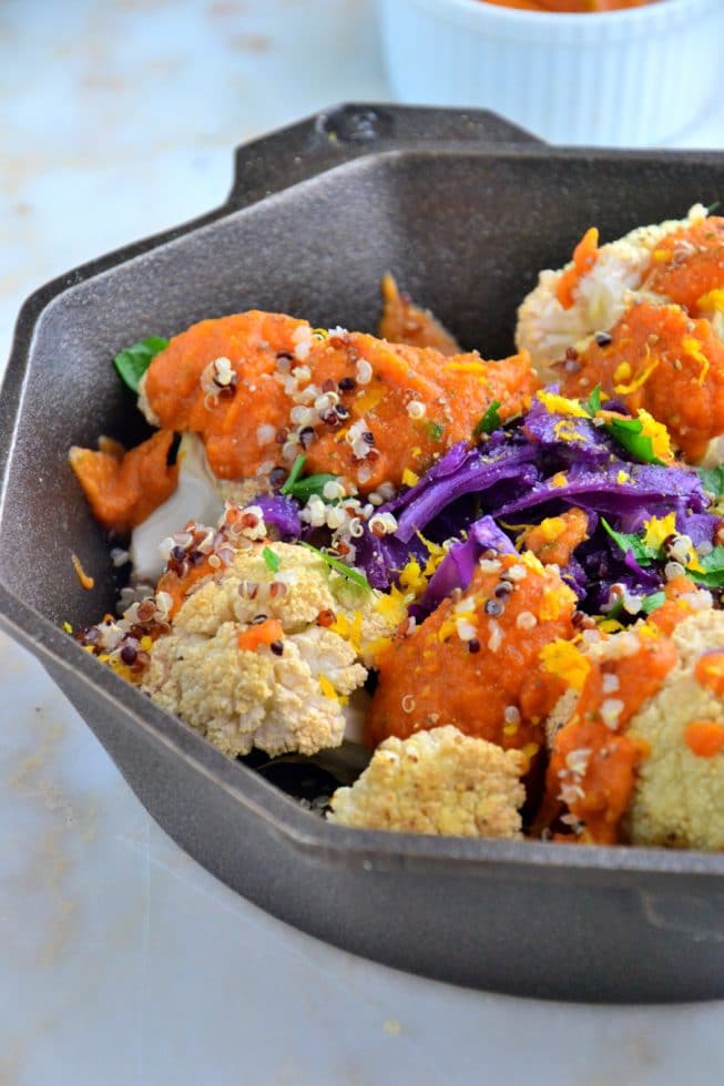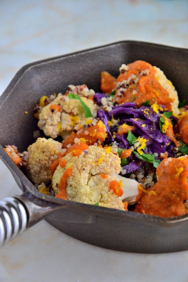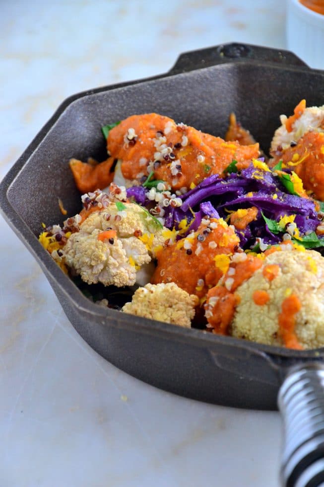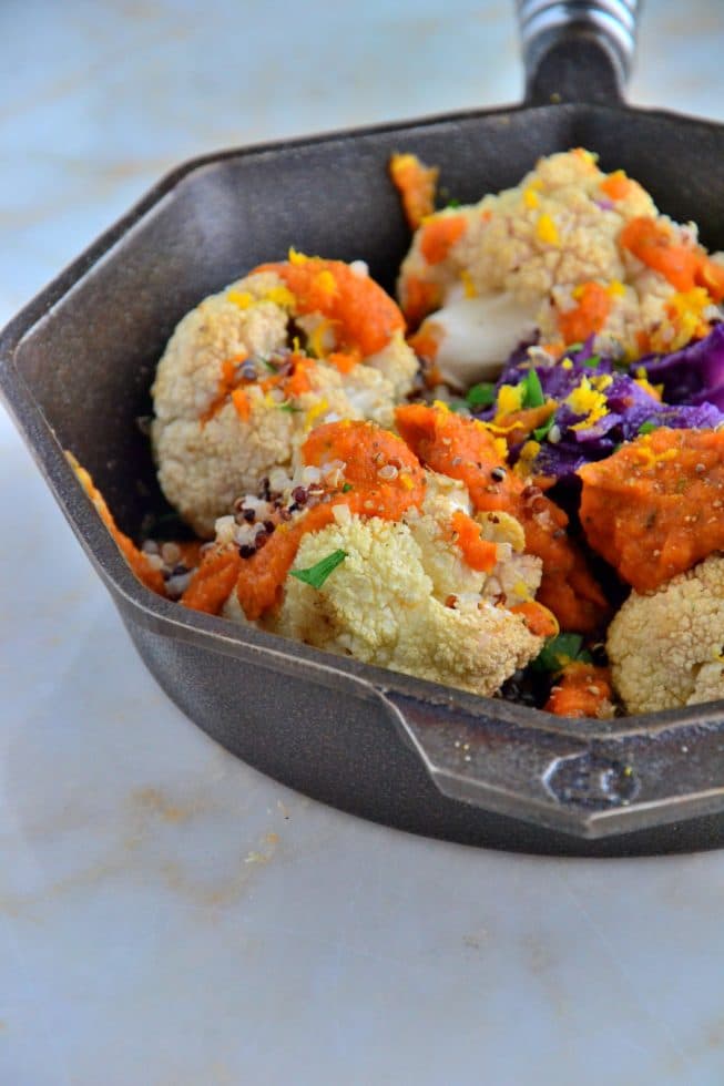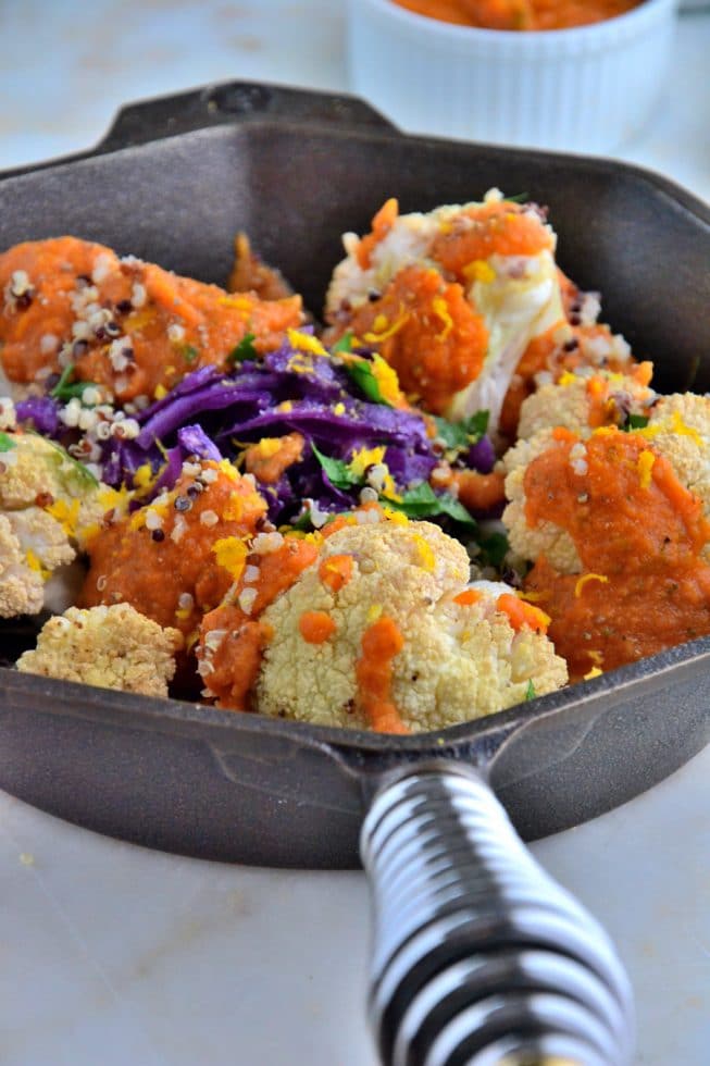 In the center of a large serving platter or in a large skillet, add 3/4 of the cooked quinoa. Then add the roasted cauliflower and cabbage on top of the quinoa. Add the remaining 1/4 of the cooked quinoa on top and drizzle with the tomato sauce. Season to taste with sea salt and pepper and serve warm. Garnish with the parsley and orange zest.