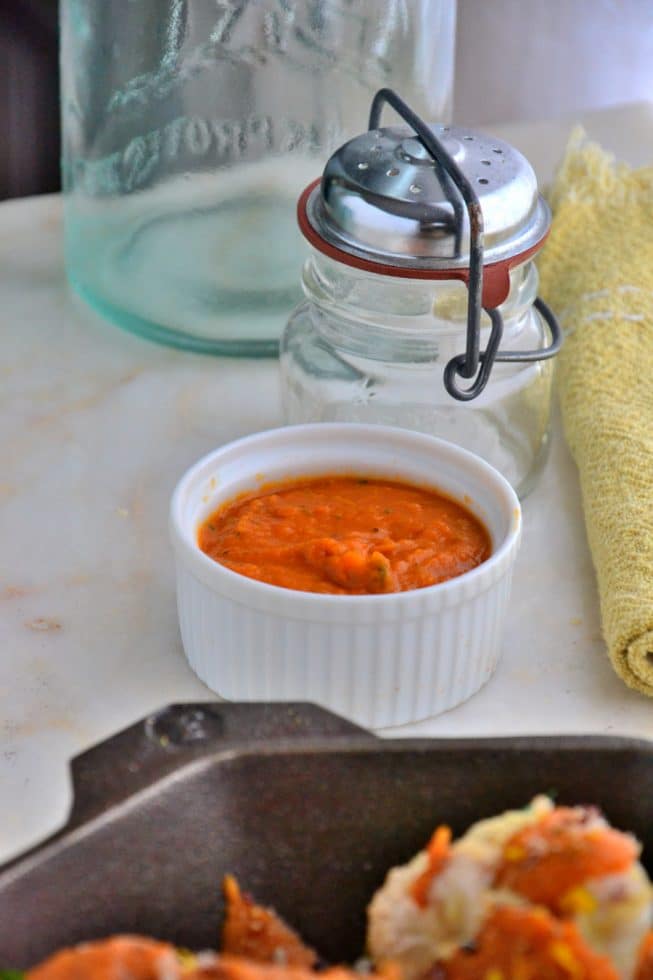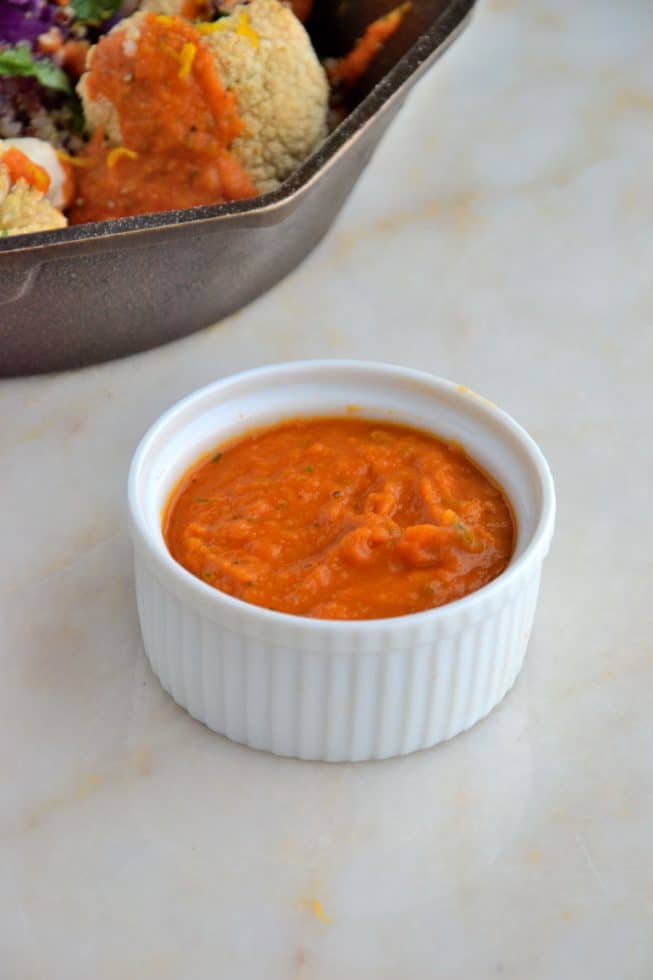 This ‘creamy’ and thick tomato tahini sauce is quite possibly the best sauce you’ll make all year. Plus, it’s full of protein, fiber and nutrients. You surely can’t find that in a jarred tomato sauce in the store, folks. You’ll want to make it over and over again. I just made it last weekend to serve over roasted chickpeas and it was delish. It’s also fabulous for any of your homemade pizzas. You know I LOVE pizza!