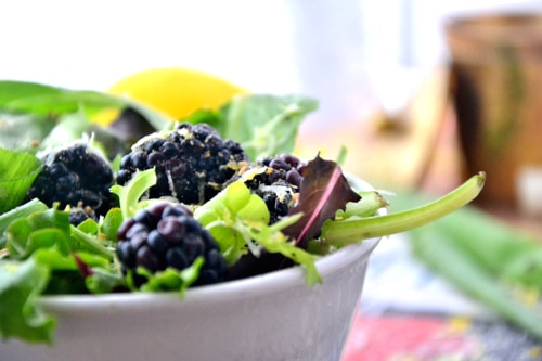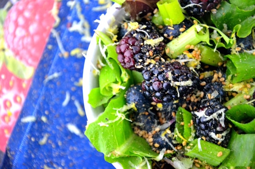 In a small bowl, whisk lemon juice, vinegar, oil, sesame seeds, sea salt and pepper. Pour dressing over blackberry salad; gently toss to combine.