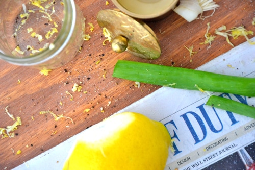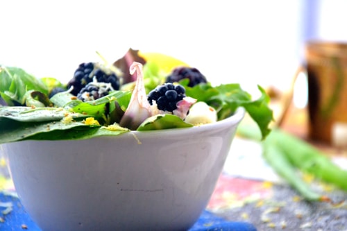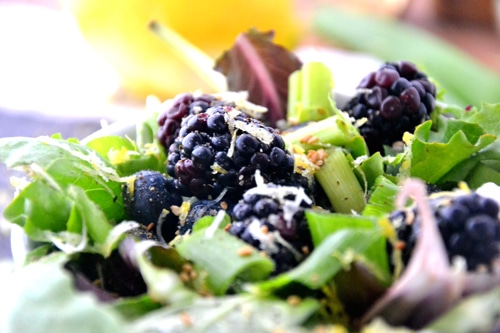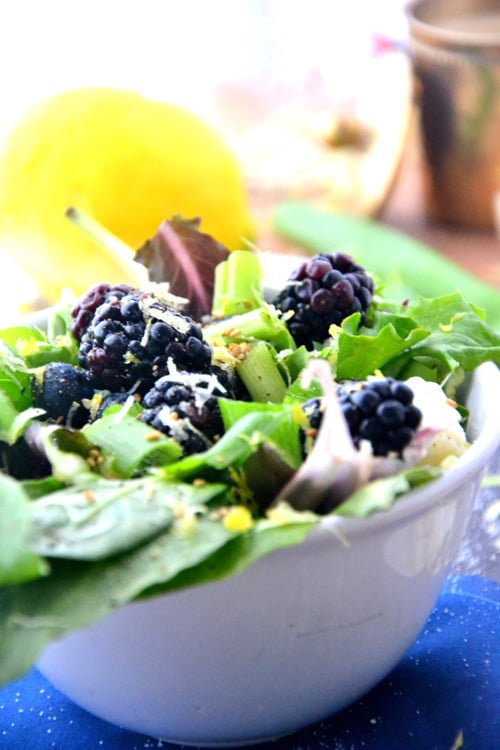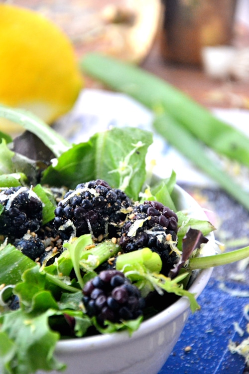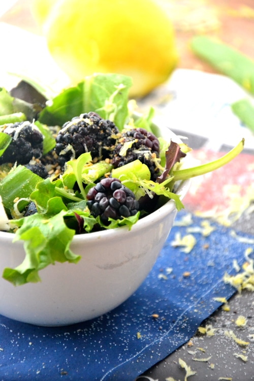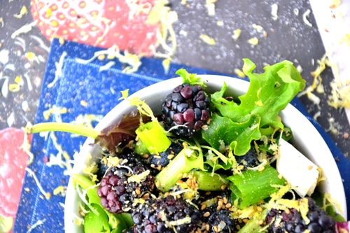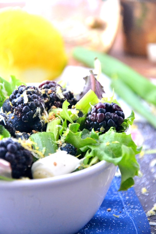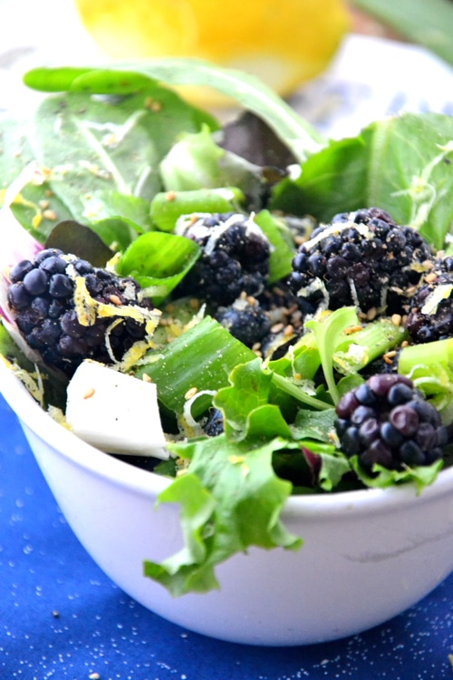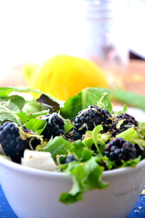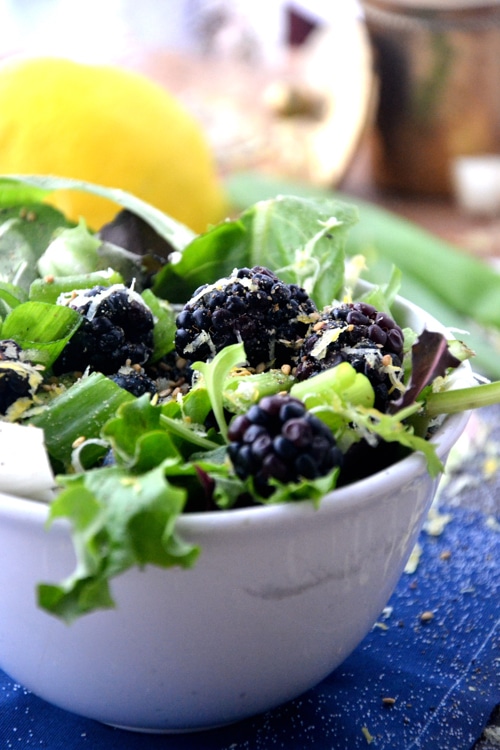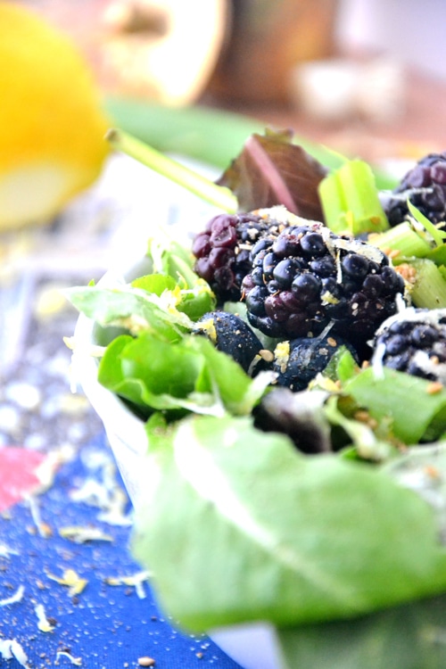 In a large bowl, combine blackberries, lemon zest, mixed greens, dill and scallions. Set aside.