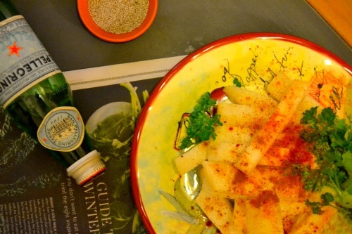 Now, I’ve had jicama before but just as a mere topping on a salad, not eaten alone with hummus or salsa.